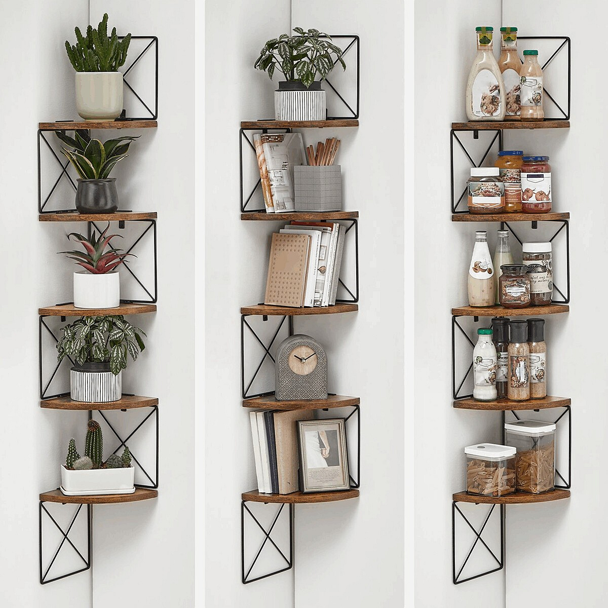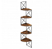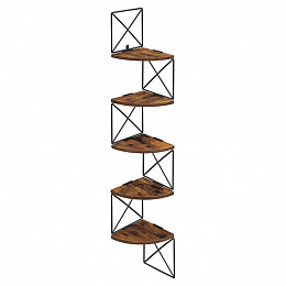 Nástěnná rohová police v dekoru old wood kombinuje teplé hnědé odstíny MDF desek s černým kovovým rámem, který zajišťuje stabilní upevnění a zajímavý industriální vzhled. Police je tvořena pěti segmenty ve tvaru čtvrtkruhu, které jsou navzájem propojeny kovovými prvky s křížovým vzorem, což přispívá k pevnosti a zároveň vytváří vzdušný design. Rozměry 127,5 × 20 cm umožňují efektivní využití rohových prostorů pro vystavení dekorací či drobných předmětů. Povrch MDF desek je upraven tak, aby připomínal strukturu starého dřeva, což dodává policím rustikální charakter. Díky kombinaci materiálů a konstrukčnímu řešení je police vhodná do moderních i vintage interiérů.