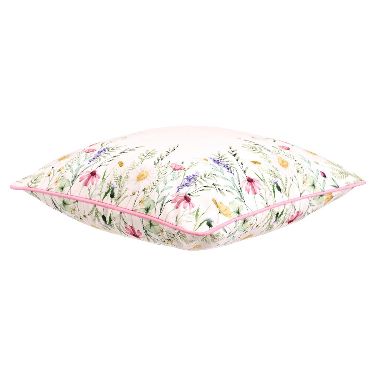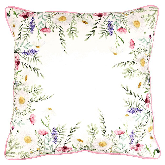 Polštář s výplní o rozměru 45 x 45 cm nabízí jemné sametové provedení potahu s motivem lučních květin, které rámují bílý střed. Vyroben je ze 100% polyesteru, což zajišťuje snadnou údržbu a příjemný dotek. Dekorativní polštář je vhodný pro doplnění sedacích souprav, postelí nebo křesel a přináší do interiéru svěží přírodní atmosféru. Jeho měkká výplň poskytuje pohodlí a zároveň udržuje tvar. Růžové lemování dodává celku jemný barevný akcent.