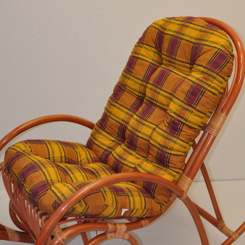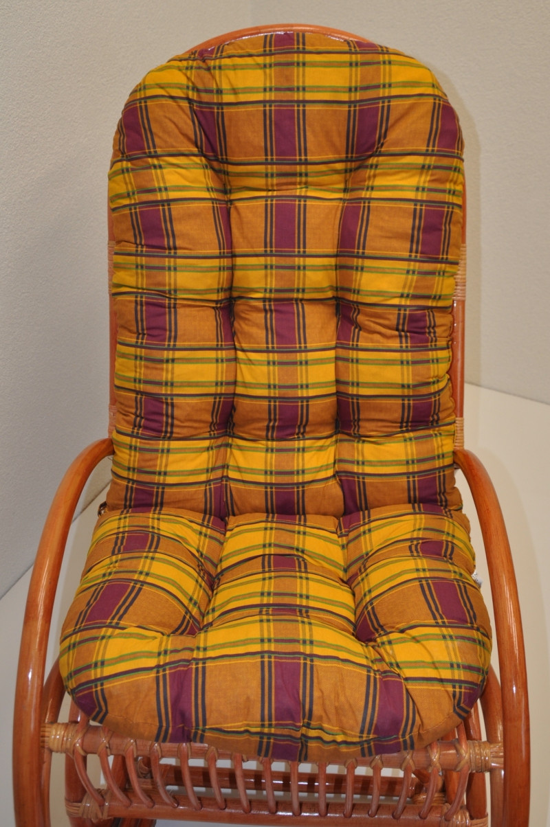 Samostatný polstr na ratanové houpací křeslo dle obrázku. | Polstr je vhodný na námi prodávané houpací křesla o velikosti 62x140x96 cm. Materiál polstru je 100% bavlna, náplň polstru je drcený molitan. Celková velikost polstru na houpací křeslo je 130x55 cm. Polstr je z jednoho kusu a je příčně prošitý. Prošití tak dělí sedací a opěrnou část pro snadné usazení polstru na křeslo. Velikost sedací části je 45x55 cm a velikost opěradlové části je 85x55 cm. Polstr je možné prát na 40oC nebo čistit v čistírně. Polstr je vyráběn v České republice