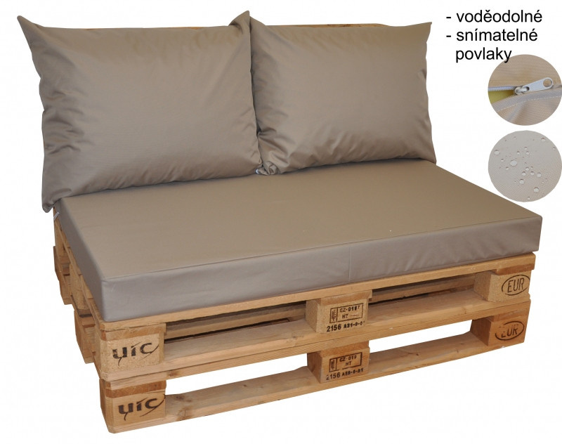Sada polstrů na paletové sezení pro 2 osoby. | Sada polstrů na paletové sezení obsahuje: - sedací polstr o velikosti 120x80 cm z kvalitního deskového molitanu o síle 10 cm - 2 opěradlové polštáře o velikosti 60x50 cm Polstry jsou vyrobeny z kvalitní voděodolné látky Oxford 600D. Všechny povlaky paletových polstrů jsou snímatelné a zapínatelné na zip. Polstry na paletové sezení jsou vyrobeny v České republice.