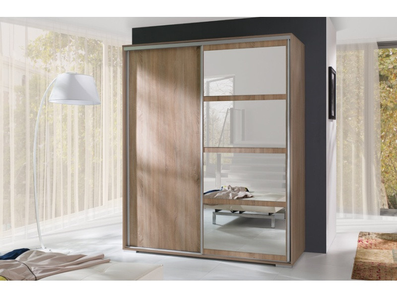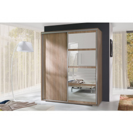 Skříň LEO je vyrobena z laminované 16 mm dřevotřísky. Rozdělení vnitřku dle detailní fotografie. Okraje jsou dýhovány. Skříň má posuvné dveře, na jedné straně skříně zrcadlo.