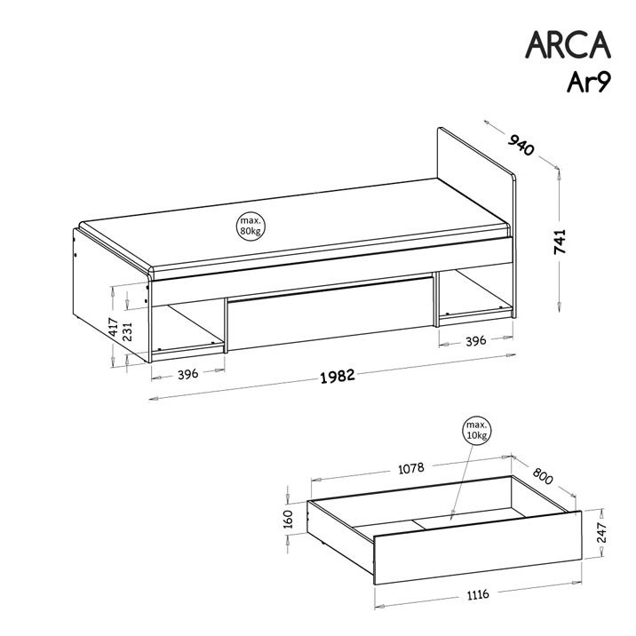 Nábytek ARCA je moderní nábytek určen do dětských a studentských pokojů. Nábytek je bezúchytový. Hrany jsou zakončeny ABS hranou. Šíře použitého materiálu - lamina je 16 a 22 mm, které je odolné proti poškrábání a vlhkosti. Šuplíky nábytku ARCA mají kuličkové pojezdy, které Vám zajistí lehké otevírání šuplíků. Nábytek se vyrábí ve dvou barevných provedeních, a to Bílá arktická a Bílá Arktická + Dub Wotan . Postel je včetně roštu.