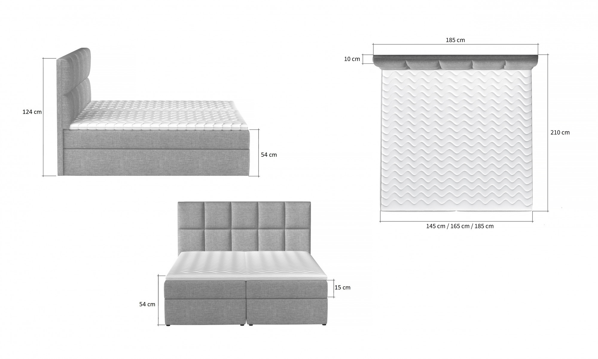 Postel se skládá z několika různých vrstev, kdy každá plní určitou funkci. Nejdůležitější částí postele je spodní rám, který tvoří dřevěný dělený box - úložný prostor postele. Na tomto dřevěném boxu je uložena kvalitní bonelová matrace. Na matraci je umístěna svrchní matrace neboli topper. Boxspring Gloria se vyrábí ve třech rozměrech.