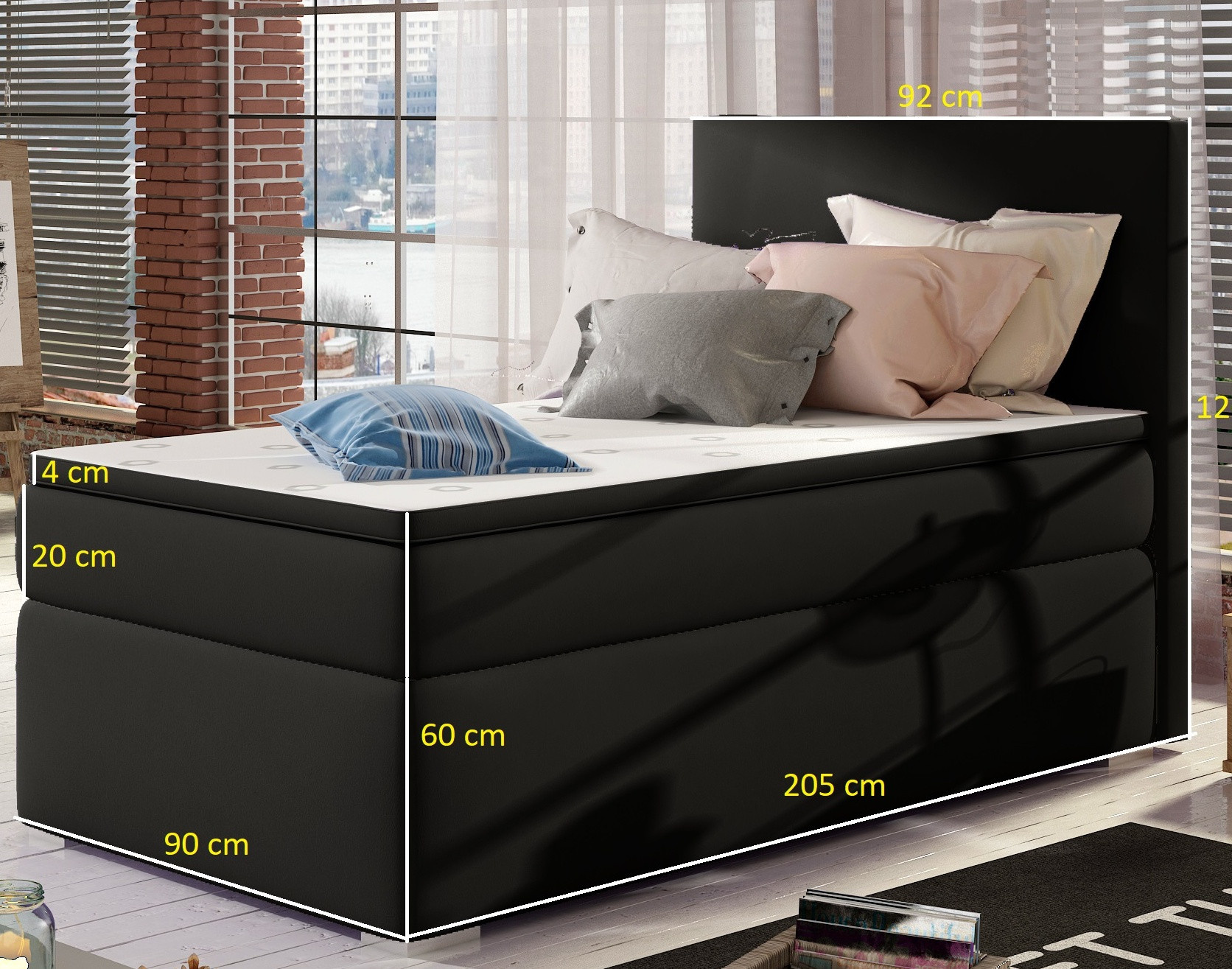 Postel se skládá z několika různých vrstev, kdy každá plní určitou funkci. Nejdůležitější částí postele je spodní rám, který tvoří dřevěný dělený box - úložný prostor postele. Na tomto dřevěném boxu je uložena kvalitní bonelová matrace. Na matraci je umístěna svrchní matrace neboli topper. Boxspring ROCKIE se vyrábí v jednom rozměro 90x200 cm.