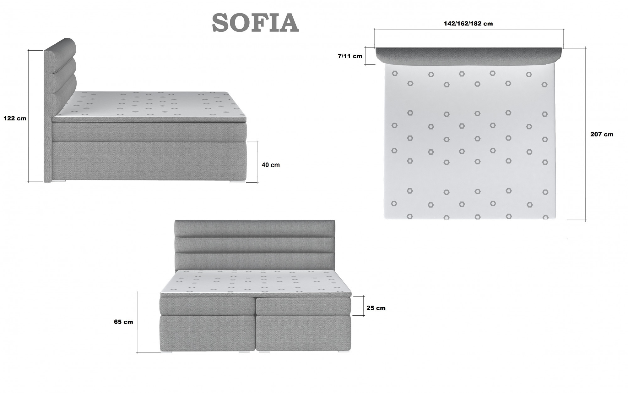 Postel se skládá z několika různých vrstev, kdy každá plní určitou funkci. Nejdůležitější částí postele je spodní rám, který tvoří dřevěný dělený box - úložný prostor postele. Na tomto dřevěném boxu je uložena kvalitní bonelová matrace. Na matraci je umístěna svrchní matrace neboli topper. Boxspring Sofia se vyrábí ve třech rozměrech.
