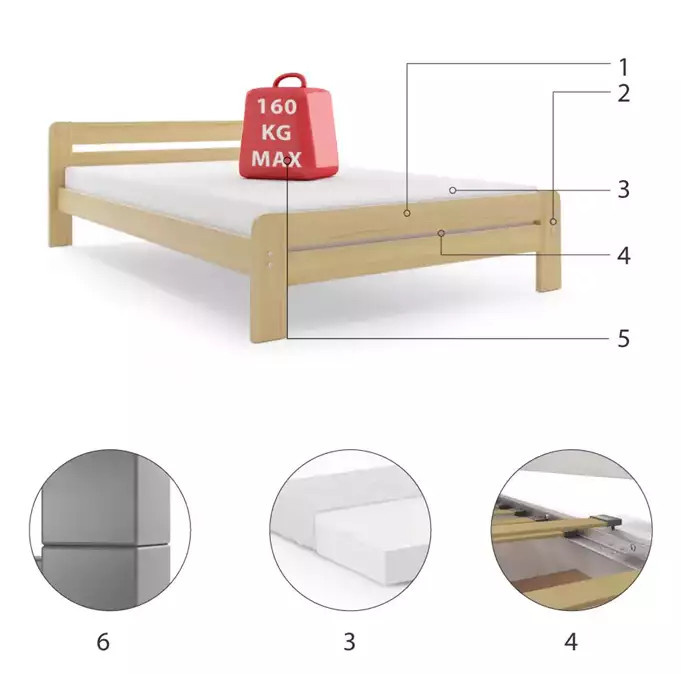 - Rám postele - vyrobený z borovicového dřeva, natřený vodním lakem.
