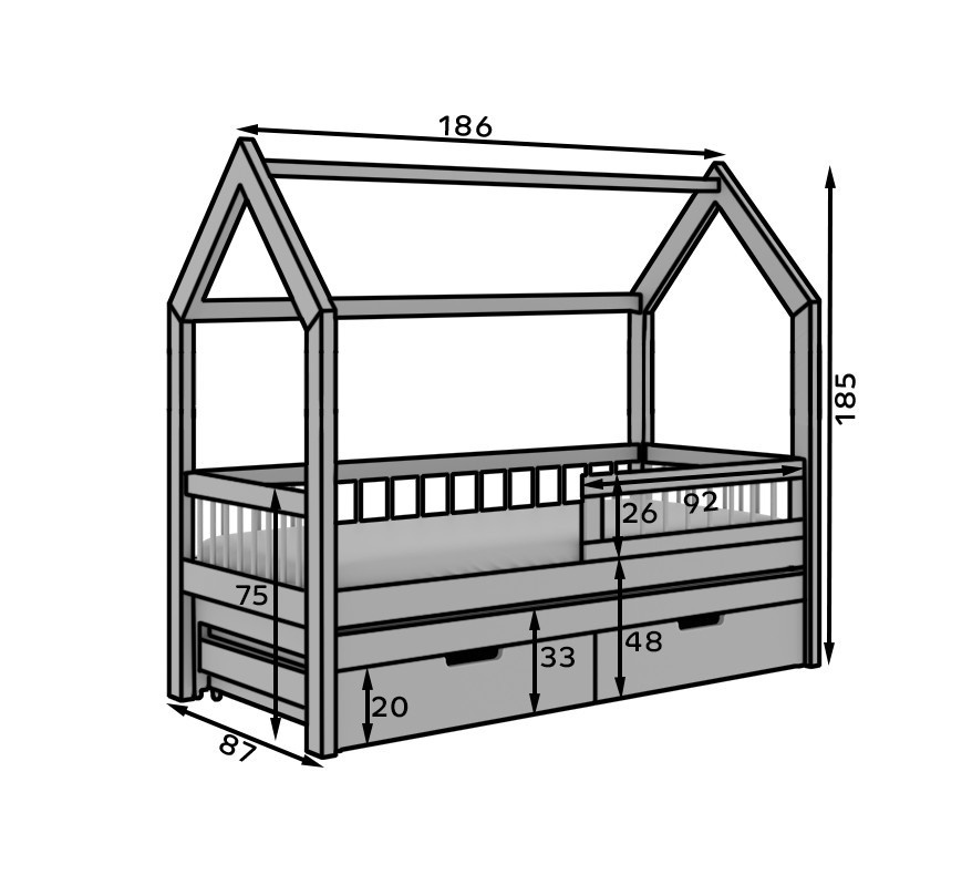**Postel Domek Artes** je stylové a funkční řešení pro rodiny, které si cení praktičnosti a estetiky v jednom. Jedná se o dvoulůžkovou postel inspirovanou tvarem domečku, která vnáší do interiéru útulnou a teplou atmosféru. Jeho jedinečný design zajišťuje, že se dokonale hodí jak do dětského, tak do studentského pokoje, vytvářejíc prostor podporující relaxaci a zábavu.Postel je vybavena **výsuvnou matrací**, což umožňuje pohodlné využití dvěma osobami – ideální řešení pro přespání hostů nebo sourozenců sdílejících pokoj. Dodatečně má **praktické zásuvky**, které poskytují dodatečný prostor pro uložení ložního prádla, hraček nebo jiných doplňků, což pomáhá udržovat pořádek.