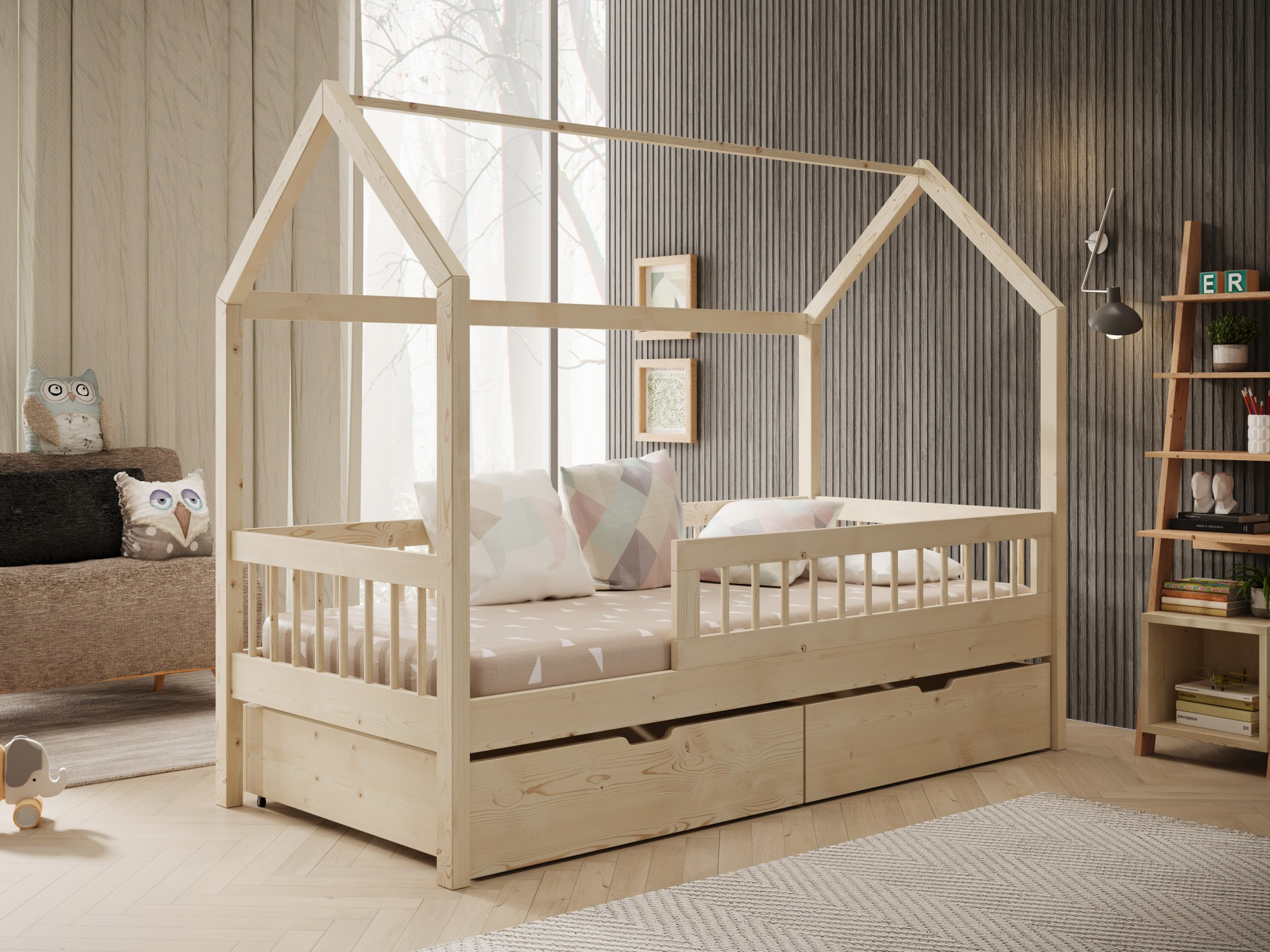 Postel domek Galicja je výjimečný nábytek, který spojuje funkčnost a design inspirovaný útulnou, skandinávskou estetikou. Vyrobeno z masivního dřeva, postel zajišťuje stabilitu a trvanlivost, zároveň dodává interiéru teplý, přírodní půvab. Jeho konstrukce ve tvaru domečku podněcuje dětskou představivost a vytváří útulné místo pro hraní a odpočinek. Ideálně se hodí jako centrální prvek dětského pokoje, zajišťující pohodlný spánek a inspirující ke kreativní hře. Jednoduchá forma a přirozené provedení způsobují, že postel Galicja se harmonicky začlení do každého interiéru, bez ohledu na styl uspořádání.