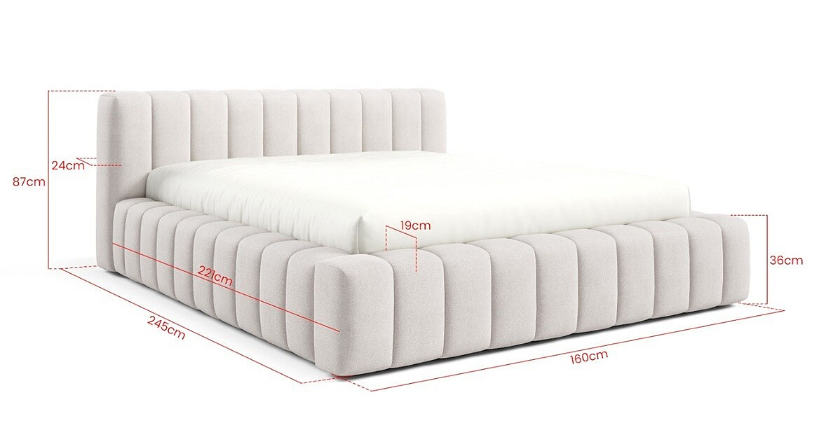 Postel GINO je potažena vysoce kvalitní potahovou látkou, která dodává interiéru nádech luxusu a elegance. Její jemná textura a odolnost zajišťují dlouhou životnost a snadnou údržbu. S rozměry spací plochy viz parametry produktu je ideální volbou pro jednotlivce, kteří si přejí prostorné a pohodlné lůžko.