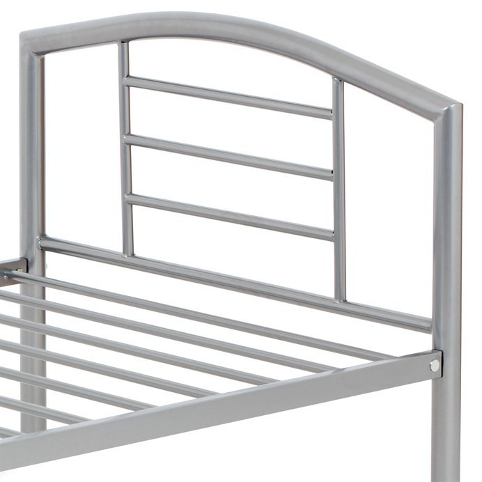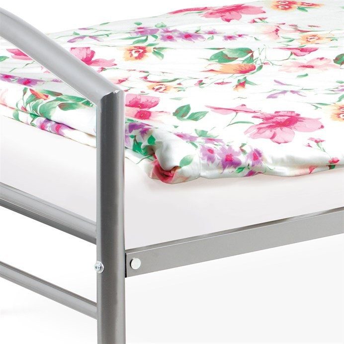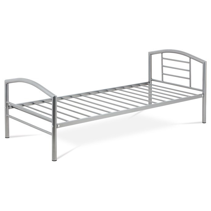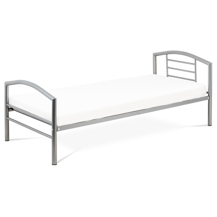 Jednolůžková postel o rozměru 90x200 cm v šedém matném provedení je vyrobena z pevného kovu, který zajišťuje stabilitu a dlouhou životnost. Rám postele tvoří jednoduché, ale pevné kovové profily s obloukově tvarovanými čely, která dodávají lehkost a moderní vzhled. Ložná plocha je tvořena kovovými latěmi, které poskytují dostatečnou oporu matraci a zároveň umožňují cirkulaci vzduchu. Povrchová úprava v matném stříbrném lesku je odolná vůči poškrábání a snadno se udržuje. Postel je vhodná pro standardní jednolůžkové matrace a díky své konstrukci je ideální do studentských pokojů, hostinských prostor nebo menších ložnic.