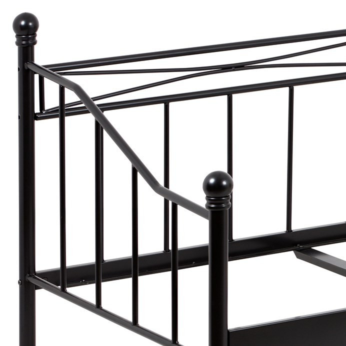 Jednolůžková postel o rozměru 90x200 cm je vyrobena z pevného kovu s matnou černou povrchovou úpravou, která zajišťuje odolnost proti poškrábání a snadnou údržbu. Design rámu kombinuje jednoduché rovné i mírně zakřivené linie s decentními ozdobnými prvky na čelech, což dodává posteli nadčasový vzhled vhodný do různých interiérů. Konstrukce je doplněna o střední podpěrnou nohu pro zvýšení stability a rovnoměrné rozložení váhy matrace. Postel je určena pro matrace o rozměru 90x200 cm a její pevná kovová základna je navržena pro dlouhou životnost a spolehlivost. Díky svému minimalistickému stylu a kvalitnímu zpracování představuje praktickou volbu pro ložnice, studentské pokoje či hostinské místnosti.