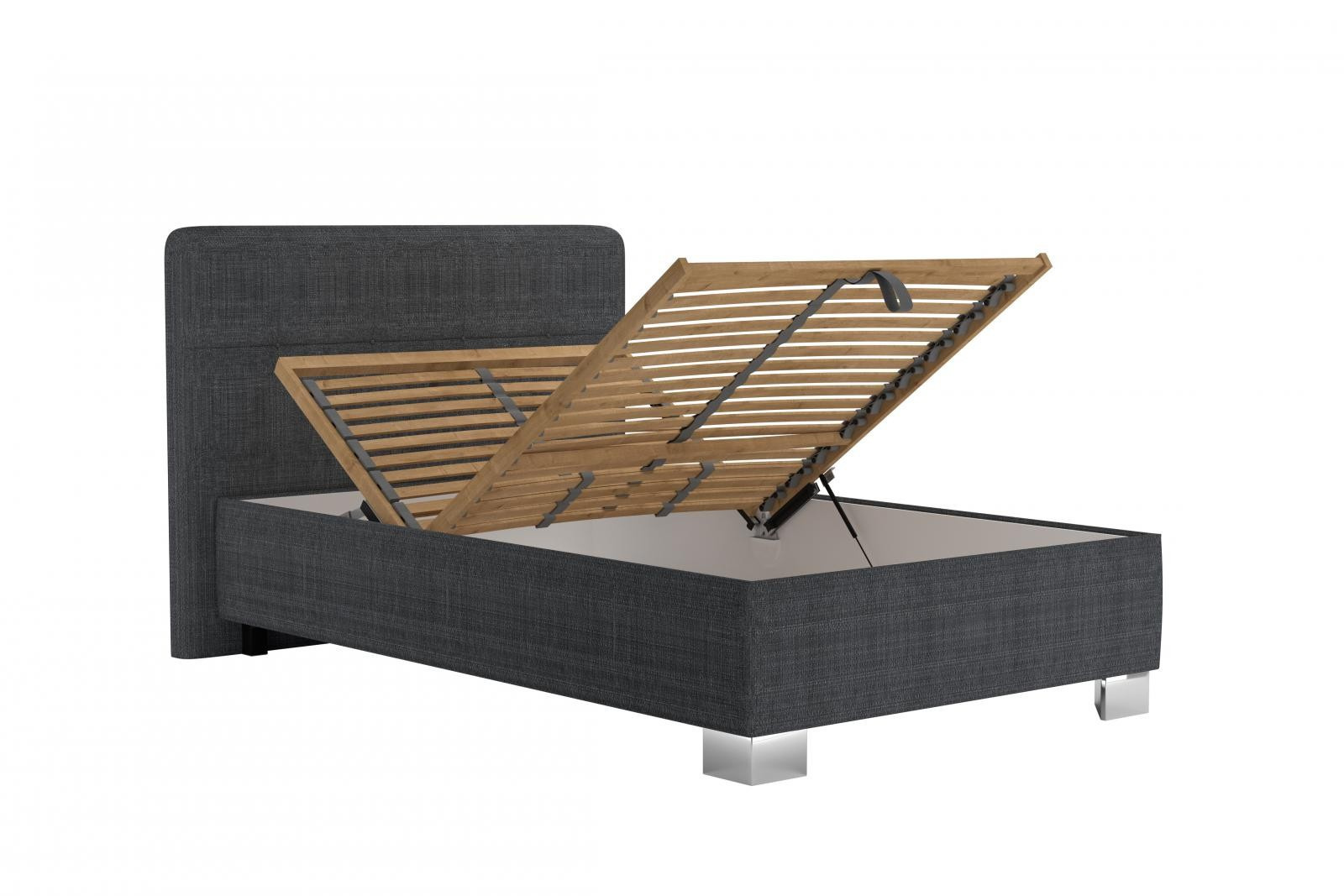 Moderní postel, která se hodí nejen do studentských nebo dětských pokojů, ale také do menších ložnic. Základem lůžka je 28 lamelový rošt s mechanickým polohováním hlavy a nohou (7 poloh hlavy, 1 poloha nohou), s nastavením tuhosti lamel a s popruhem proti přetížení. Rošt se skládá z 28 lamel uložených ve výkyvných kaučukových pouzdrech. Snadnější manipulaci při otevírání úložného prostoru zajišťují plynové písty. Součástí postele je úložný prostor, který se otevírá od nohou (pomocí plynových pístů). Tuto postel nabízíme také v dalších rozměrech. Zboží je dodáváno v demontu.