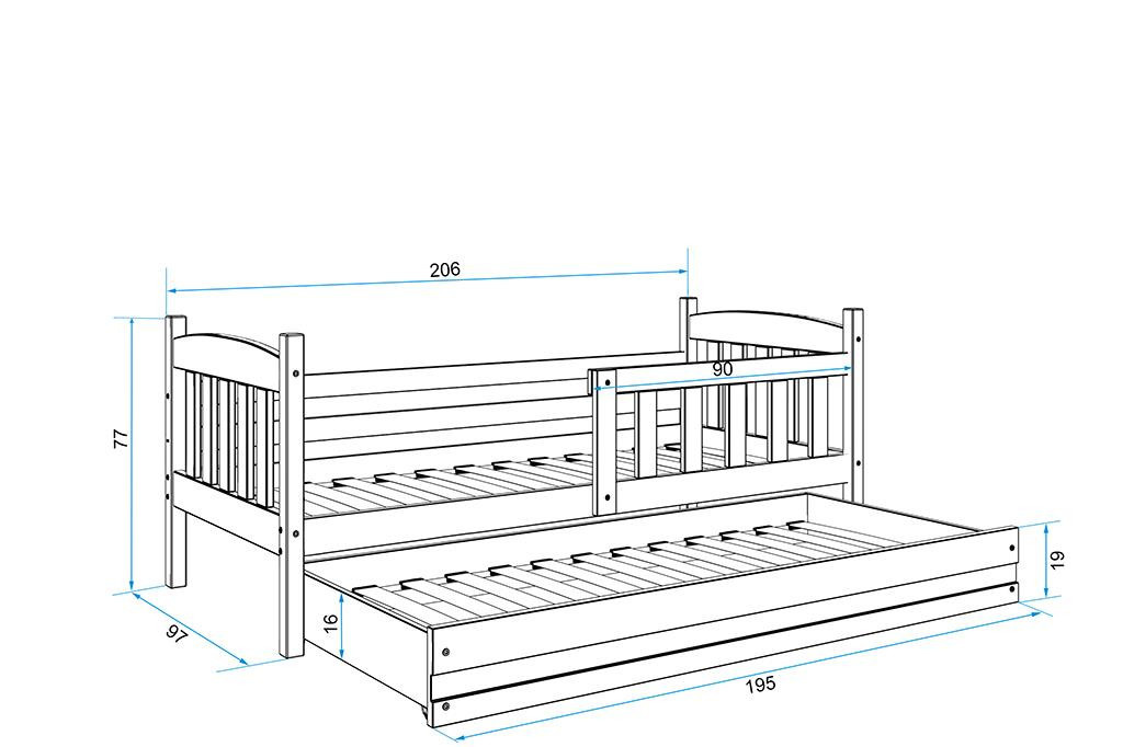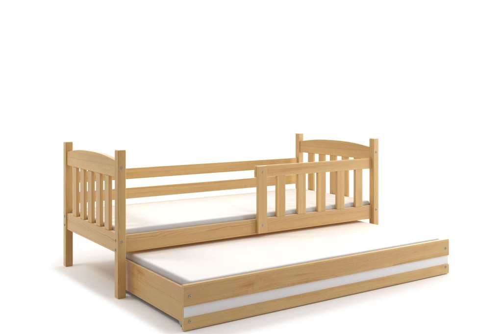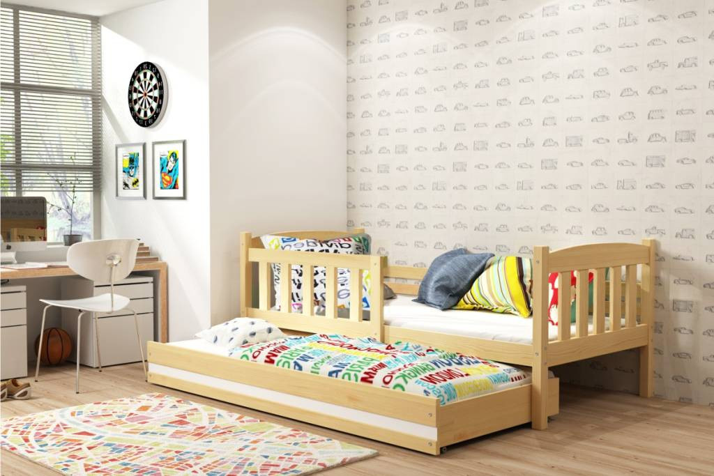 Dětská postel Kuba II je určena pro ty, kteří pro své dítě hledají funkčnost, pohodlí a kvalitu. Postel je vyrobena z borovicového dřeva. Její stabilní konstrukce, zaoblené hrany a zábrana, která je v ceně postele, zajišťují bezpečnost a pohodlí dítěte. Zábranu si můžete podle potřeby umístit na pravou, nebo levou stranu postele. Součástí postele je také praktická přistýlka s matrací, kterou můžete využít pro druhé dítě, nebo když u Vašeho dítěte bude chtít přespat kamarád/ka. Obě části postele mají rošt a pěnovou matraci se snímatelným potahem. Plocha pro spaní je 90x200 cm (vrchní část) a 80x190 cm (přistýlka). Postel je dodávána v demontu a součástí je montážní plánek včetně všech potřebných spojovacích materiálů. Vyobrazené dekorace nejsou v ceně.