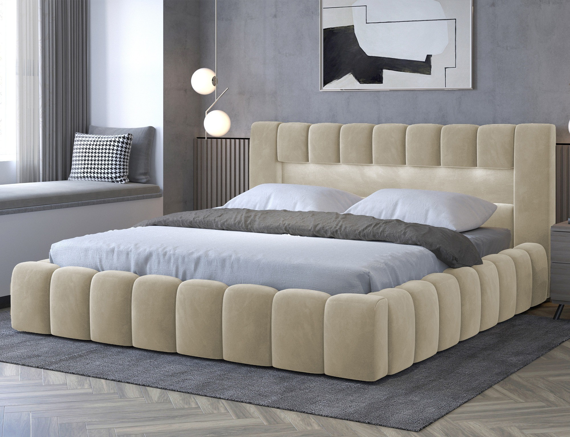 Lamica je velmi pohodlná, měkká a originální postel v glamour stylu, která zaujme svým neobvyklým tvarem a formou. Tento nábytek se skládá z těla a kovového rámu. Má také dva prostorné kontejnery na ložní prádlo. Rozměry spací plochy - můžete si vybrat ze tří verzí - 140/160/180x200 cm - poskytují dostatečný prostor pro relaxační odpočinek v ložnici různých velikostí, což bude vyhovovat vašim preferencím a možnostem. Naše postel se vyznačuje svým zpracováním, protože vysoké čelo a boky postele jsou vytvořeny s přídavnou pěnou. Estetický zážitek je umocněn podélným, rozsáhlým prošíváním. Široká škála barevných možností usnadňuje sladění postele s celou místností. Další výhodou je opěrka hlavy s LED osvětlením, díky kterému bude odpočinek ještě příjemnější. V tomto případě jde modernost a modernistický vzhled ruku v ruce s elegancí, díky čemuž bude Lamica vždy ideální volbou. Určitě stojí za to mít.