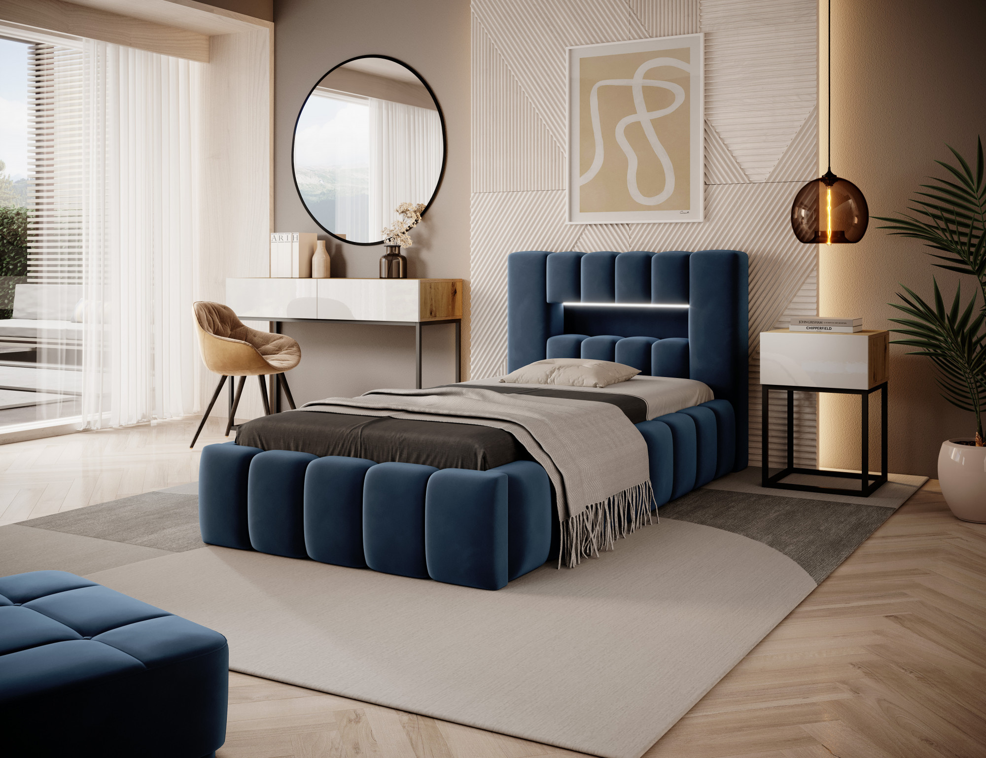 Lamica je velmi pohodlná, měkká a originální postel v glamour stylu, která zaujme svým neobvyklým tvarem a formou. Tento nábytek se skládá z těla a dřevěného rámu. Má také úložný prostor na ložní prádlo. Velikost spací plochy 90x200 cm poskytuje dostatečný prostor pro relaxační odpočinek. Naše postel se vyznačuje svým zpracováním, protože vysoké čelo a boky postele jsou vyrobeny z přídavné pěny. Estetický zážitek je umocněn podélným, rozsáhlým prošíváním. Široká škála barevných možností usnadňuje sladění postele s celou místností. Další výhodou je opěrka hlavy s LED osvětlením, díky kterému bude odpočinek ještě příjemnější. V tomto případě jde modernost a modernistický vzhled ruku v ruce s elegancí, díky čemuž bude Lamica vždy ideální volbou. Určitě stojí za to mít.