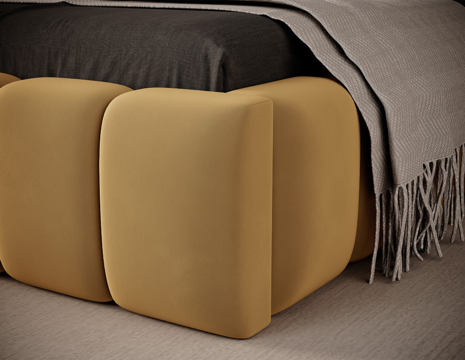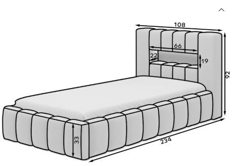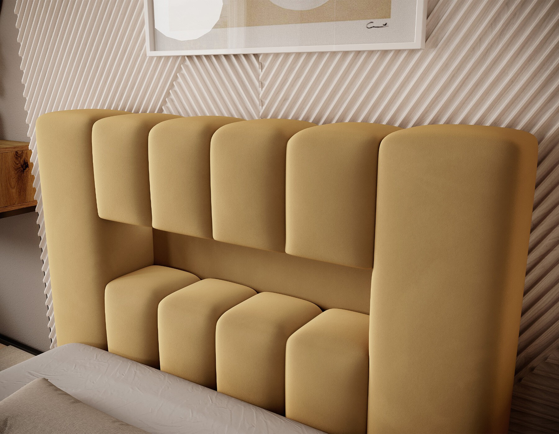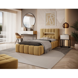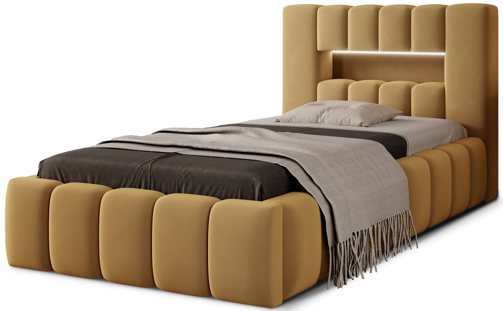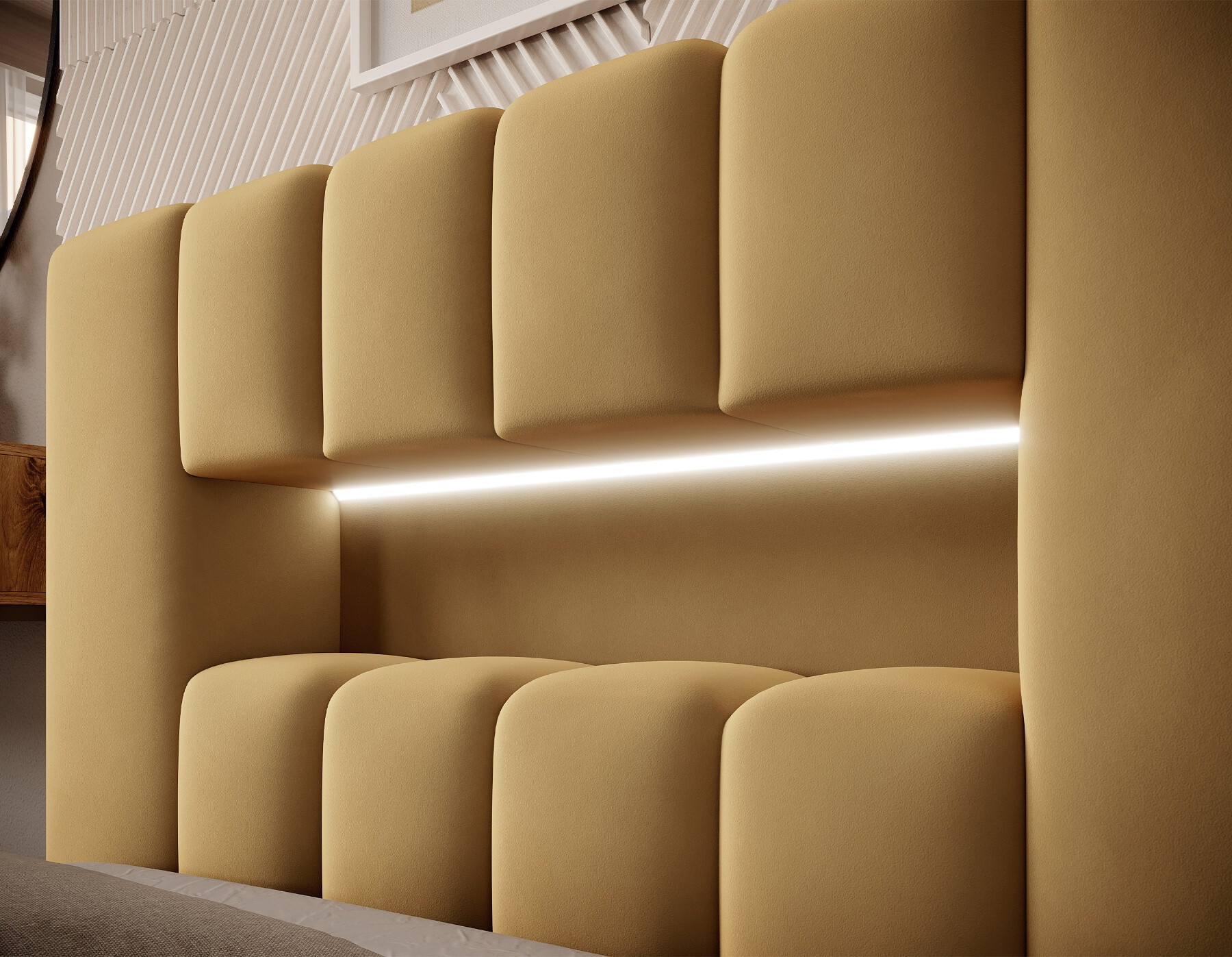 Lamica je velmi pohodlná, měkká a originální postel v glamour stylu, která zaujme svým neobvyklým tvarem a formou. Tento kus nábytku se skládá z těla a dřevěného rámu. Má také úložný prostor na ložní prádlo. Rozměry spací plochy, 90x200 cm, poskytují dostatečný prostor pro nerušený odpočinek. Naše postel vyniká svou kvalitou, protože vysoké čelo a boky postele jsou vyrobeny z přídavné pěny. Estetický zážitek je umocněn podélným, rozsáhlým prošíváním. Široká škála možností barevných schémat usnadňuje sladění postele s celou místností. Další výhodou je opěrka hlavy s LED osvětlením, která činí odpočinek ještě příjemnějším. Zde jdou modernost a modernistický vzhled ruku v ruce s elegancí, což činí Lamica dokonalou volbou v každém případě. Je to kus nábytku, který stojí za to mít.