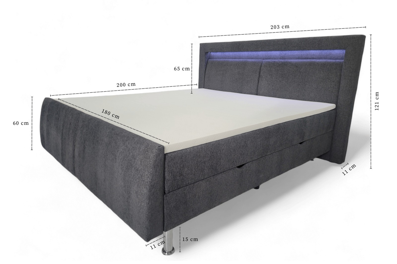 - Elegantní nohy: Designové nohy postele dodávají celkovému vzhledu lehkost a eleganci. Zároveň zajišťují dostatečnou výšku pro snadné uklízení pod postelí.