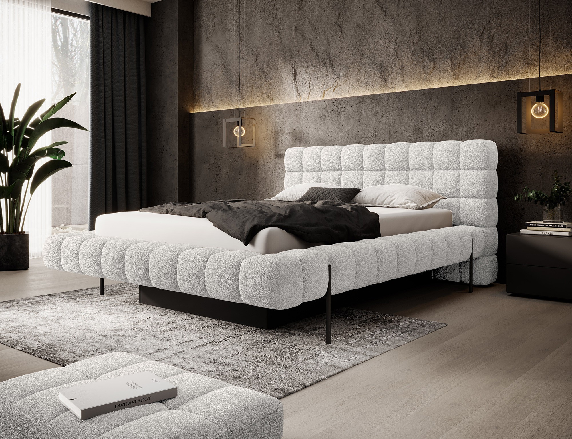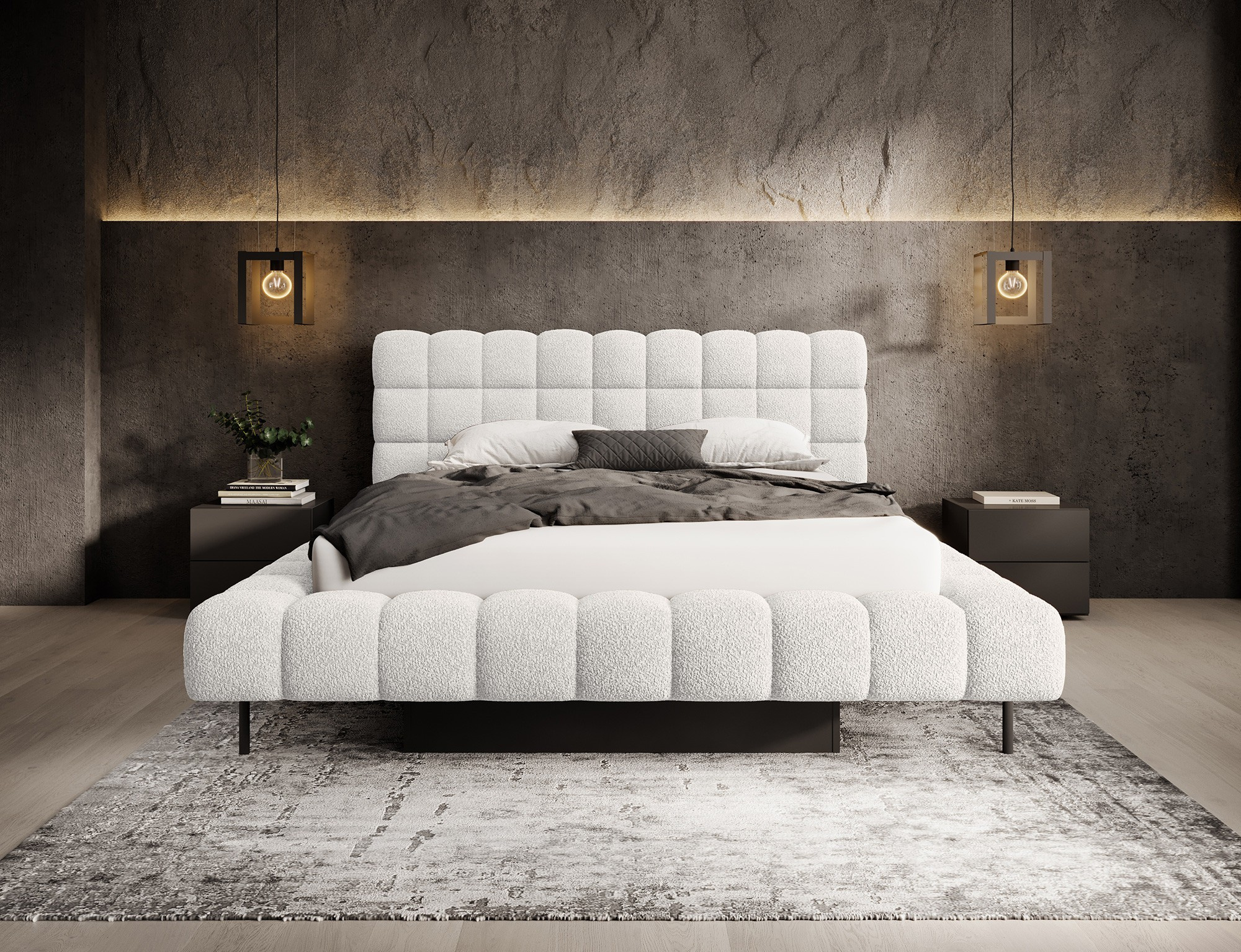 Postel Magentta kombinuje moderní design, funkčnost a výjimečné pohodlí. Jeho čalouněné opěradlo dodává nádech elegance a útulnosti, což z něj činí dokonalý středobod každé ložnice. Robustní rám a čelo postele jsou vyplněny vysoce kvalitní pěnou T2130, která poskytuje vynikající oporu a pohodlí, ať už spíte nebo odpočíváte. Dostupné ve třech velikostech: 140 cm, 160 cm, 180 cm, hodí se do různých prostorů a splňuje osobní preference.Kovový rám obsahuje 36 lamel, které rovnoměrně rozkládají váhu matrace, čímž zvyšují její odolnost a poskytují vynikající oporu. Černá kovová noha zajišťuje stabilní základnu a zároveň zdůrazňuje elegantní, minimalistický design. Praktický úložný prostor pro ložní prádlo nabízí efektivní řešení pro organizaci přikrývek, polštářů a dalších lůžkovin, čímž optimalizuje prostor ve vaší ložnici. Postel Magentta je ideální volbou pro ty, kteří si cení moderní estetiky, pohodlí a praktičnosti.