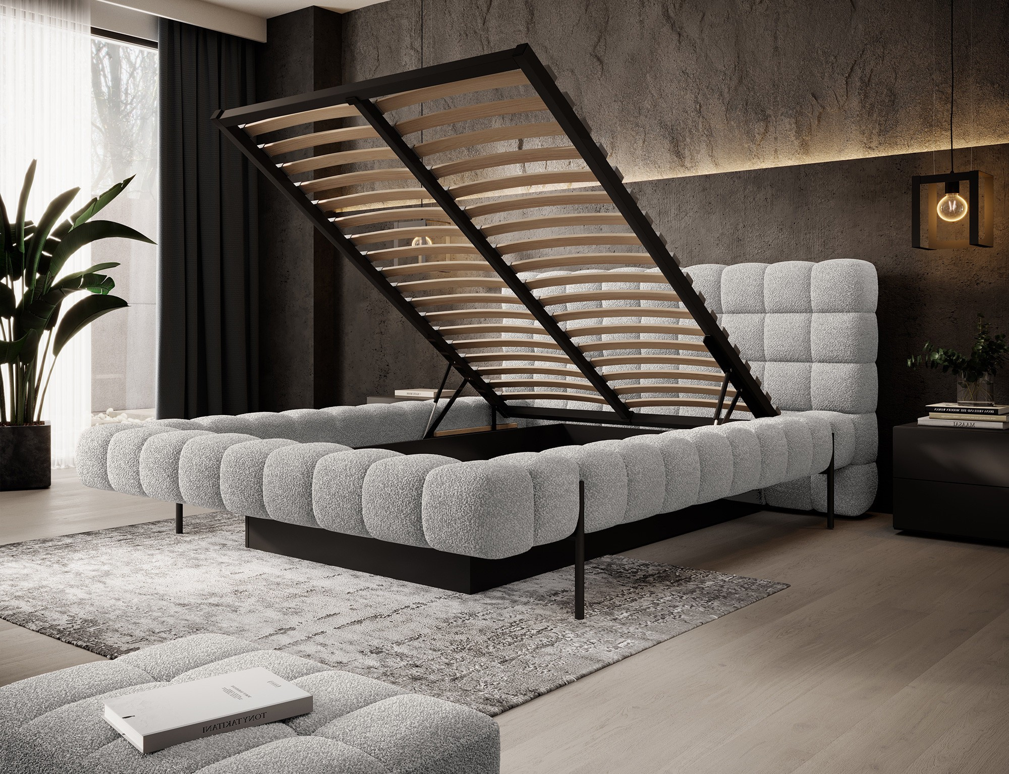 Postel Magentta kombinuje moderní design, funkčnost a výjimečné pohodlí. Jeho čalouněné opěradlo dodává nádech elegance a útulnosti, což z něj činí dokonalý středobod každé ložnice. Robustní rám a čelo postele jsou vyplněny vysoce kvalitní pěnou T2130, která poskytuje vynikající oporu a pohodlí, ať už spíte nebo odpočíváte. Dostupné ve třech velikostech: 140 cm, 160 cm, 180 cm, hodí se do různých prostorů a splňuje osobní preference.Kovový rám obsahuje 36 lamel, které rovnoměrně rozkládají váhu matrace, čímž zvyšují její odolnost a poskytují vynikající oporu. Černá kovová noha zajišťuje stabilní základnu a zároveň zdůrazňuje elegantní, minimalistický design. Praktický úložný prostor pro ložní prádlo nabízí efektivní řešení pro organizaci přikrývek, polštářů a dalších lůžkovin, čímž optimalizuje prostor ve vaší ložnici. Postel Magentta je ideální volbou pro ty, kteří si cení moderní estetiky, pohodlí a praktičnosti.