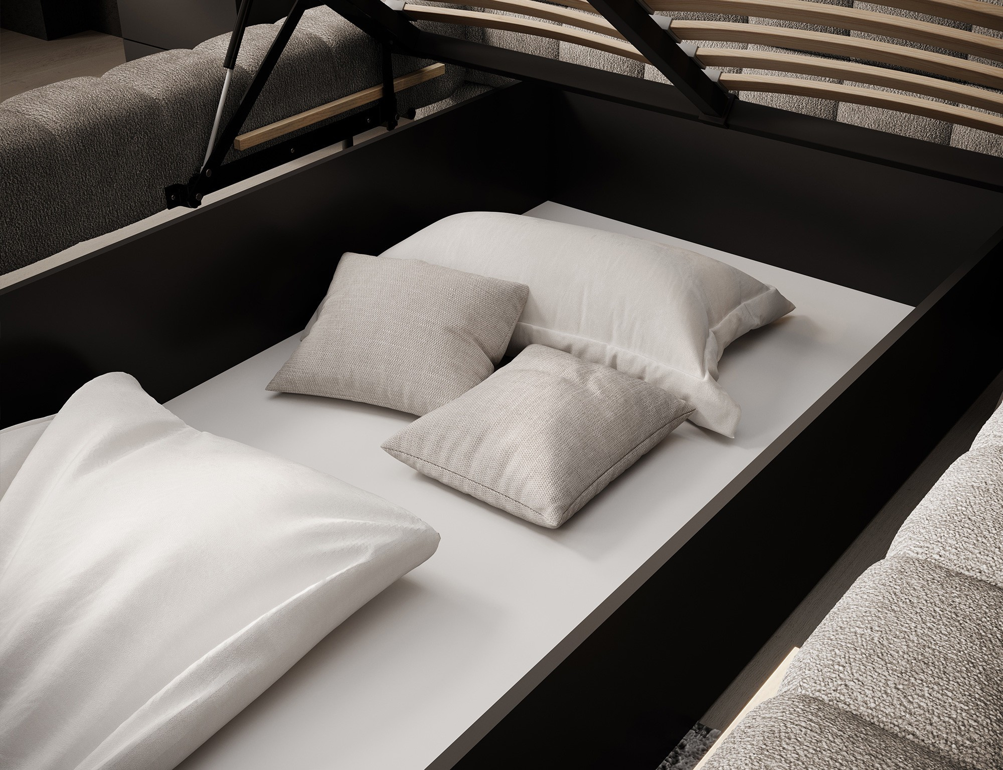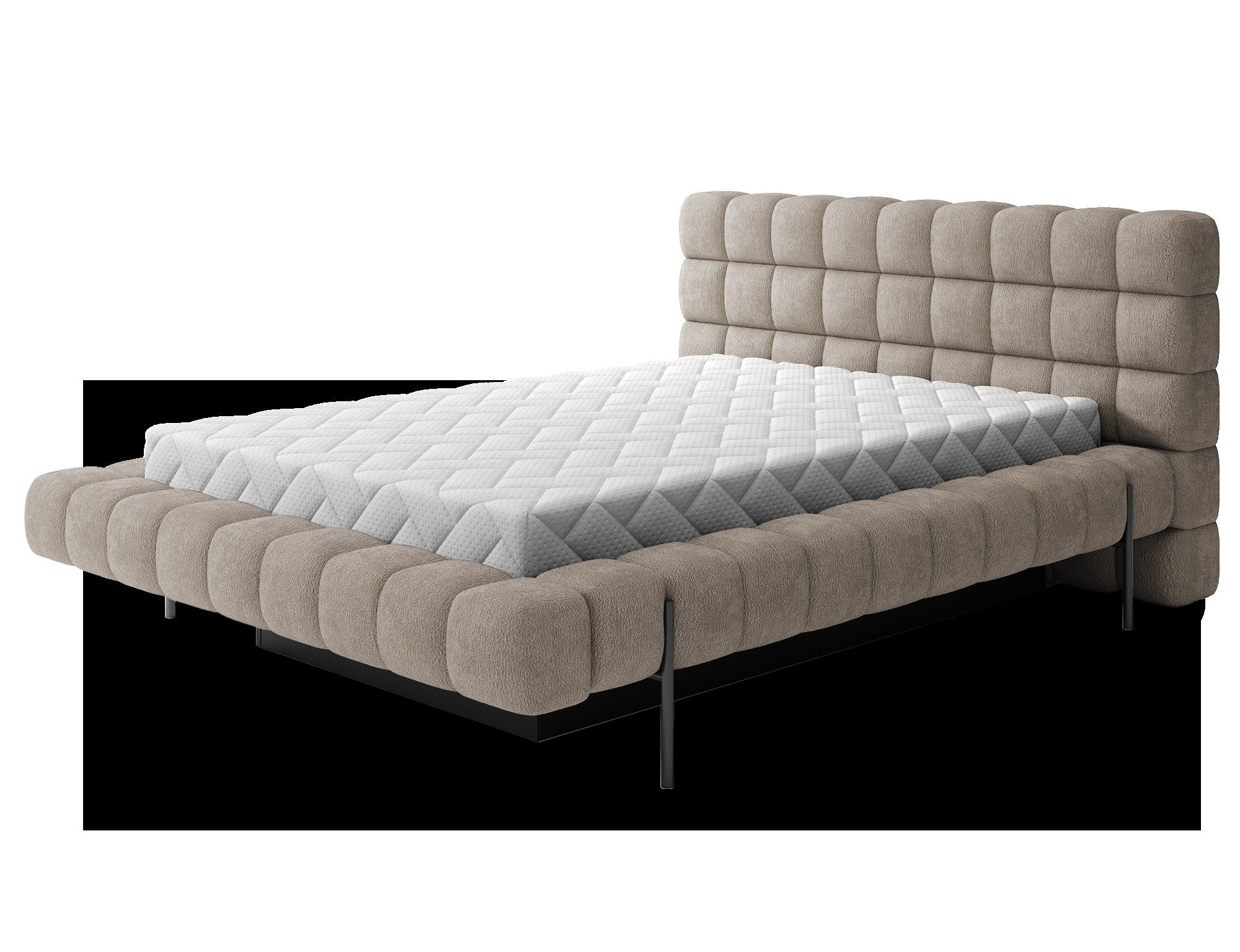Postel Magentta kombinuje moderní design, funkčnost a výjimečné pohodlí. Jeho čalouněné opěradlo dodává nádech elegance a útulnosti, což z něj činí dokonalý středobod každé ložnice. Robustní rám a čelo postele jsou vyplněny vysoce kvalitní pěnou T2130, která poskytuje vynikající oporu a pohodlí, ať už spíte nebo odpočíváte. Dostupné ve třech velikostech: 140 cm, 160 cm, 180 cm, hodí se do různých prostorů a splňuje osobní preference.Kovový rám obsahuje 36 lamel, které rovnoměrně rozkládají váhu matrace, čímž zvyšují její odolnost a poskytují vynikající oporu. Černá kovová noha zajišťuje stabilní základnu a zároveň zdůrazňuje elegantní, minimalistický design. Praktický úložný prostor pro ložní prádlo nabízí efektivní řešení pro organizaci přikrývek, polštářů a dalších lůžkovin, čímž optimalizuje prostor ve vaší ložnici. Postel Magentta je ideální volbou pro ty, kteří si cení moderní estetiky, pohodlí a praktičnosti.