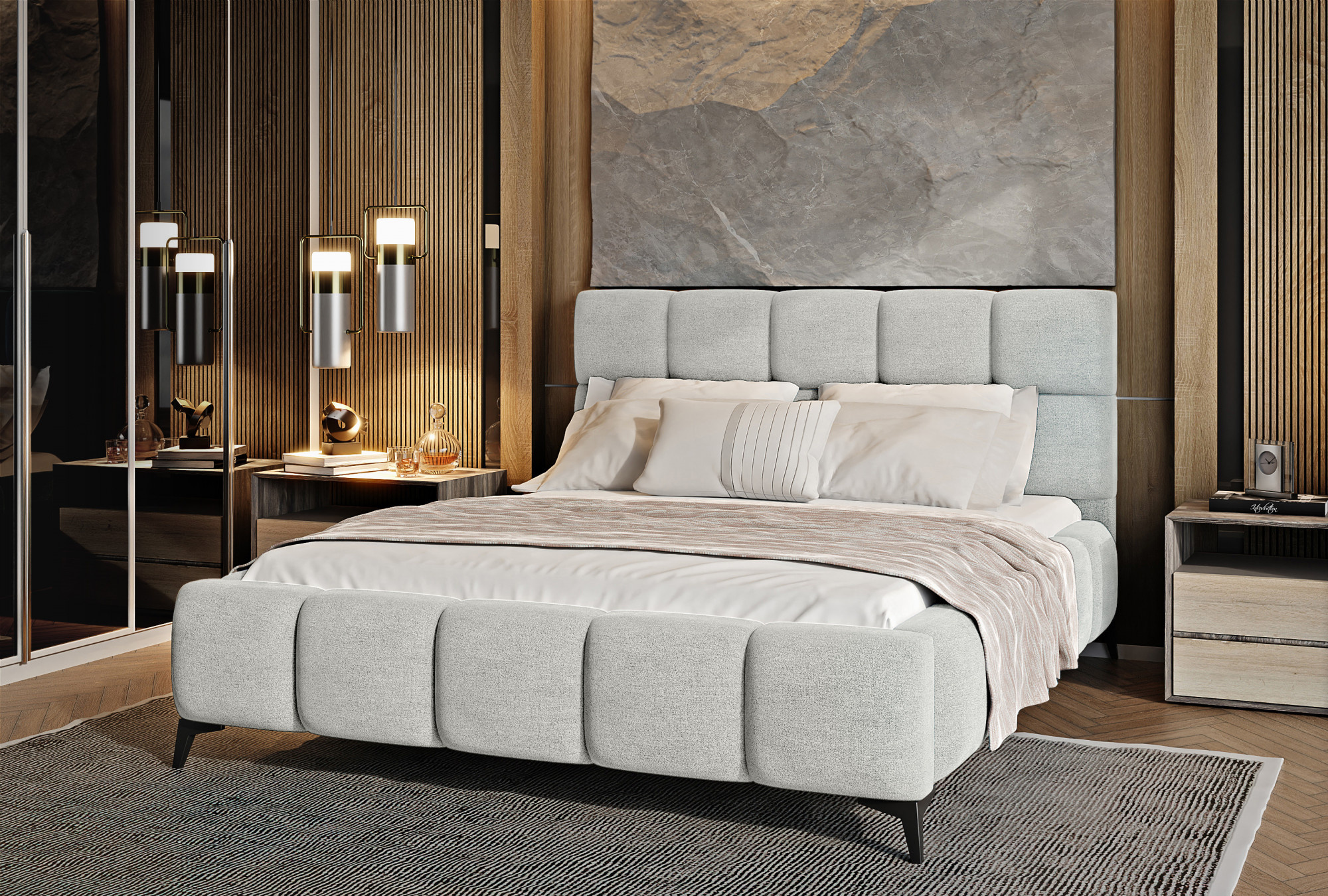 Postel Mist je kombinací moderního designu a glamour stylu, která přináší nádech elegance do každé ložnice. Opěrka hlavy má měkkou pěnovou výplň potaženou vysoce kvalitním čalouněním. Prošívání, které zdobí postel Mist, přidává styl a charakter a přináší nádech modernosti.Nábytek je k dispozici ve třech šířkách spací plochy: 140, 160, 180 x 200 centimetrů. To usnadňuje přizpůsobení postele podmínkám v bytě. Černé ocelové nohy s délkou až 13.5 centimetrů vytváří dojem, že postel se vznáší nad zemí, což dále opticky zvětšuje místnost, ve které bude postel Mist umístěna. Kromě toho je nábytek také vybaven úložným prostorem na lůžkoviny, což je velmi dobré řešení pro malé prostory a umožňuje udržovat ložnici uklizenou.
