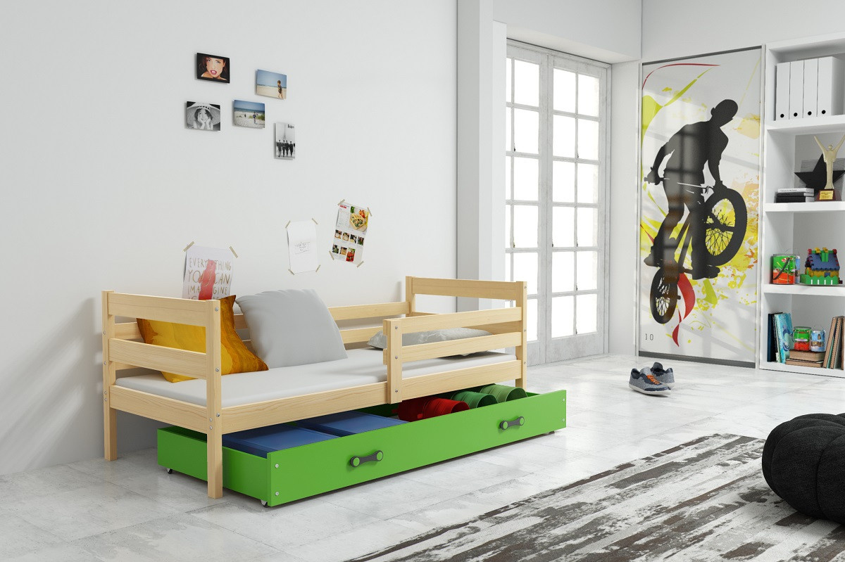 Dětská postel Norbert je určena pro ty, kteří pro své dítě hledají funkčnost a kvalitu. Postel je vyrobena z borovicového dřeva, které je lakováno 3x a tím je zajištěna jasnost a barevná stálost. Na lakování je použitý bezpečný, vodou ředitelný lak vyhovující normám. Její stabilní konstrukce, zaoblené hrany a zábrana, která je v ceně postele, zajišťují bezpečnost a pohodlí dítěte. Zábranu si můžete podle potřeby umístit na pravou, nebo levou stranu postele. Součástí postele je také praktický úložný prostor na kolečkách, rošt a pěnová matrace se snímatelným potahem. Tloušťka matrace je 7cm. Plocha pro spaní je 90x200 cm. Postel je dodávána v demontu a součástí je montážní plánek včetně všech potřebných spojovacích materiálů. Vyobrazené dekorace nejsou v ceně. Zobrazení barev na fotografii se může od skutečnosti nepatrně lišit.