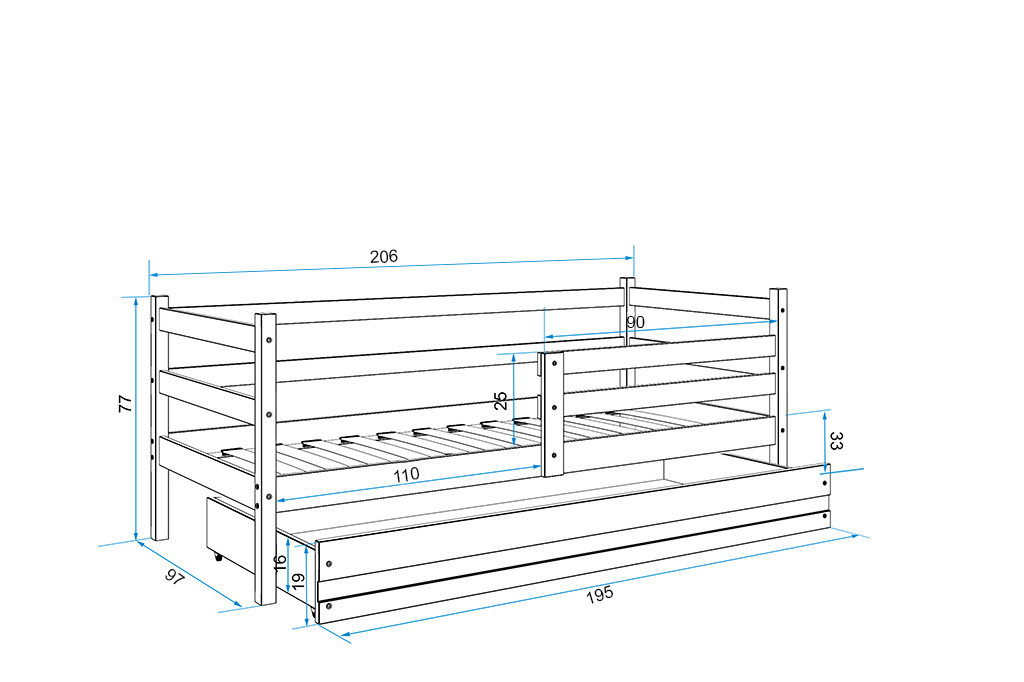 Dětská postel Norbert je určena pro ty, kteří pro své dítě hledají funkčnost a kvalitu. Postel je vyrobena z borovicového dřeva, které je lakováno 3x a tím je zajištěna jasnost a barevná stálost. Na lakování je použitý bezpečný, vodou ředitelný lak vyhovující normám. Její stabilní konstrukce, zaoblené hrany a zábrana, která je v ceně postele, zajišťují bezpečnost a pohodlí dítěte. Zábranu si můžete podle potřeby umístit na pravou, nebo levou stranu postele. Součástí postele je také praktický úložný prostor na kolečkách, rošt a pěnová matrace se snímatelným potahem. Tloušťka matrace je 7cm. Plocha pro spaní je 90x200 cm. Postel je dodávána v demontu a součástí je montážní plánek včetně všech potřebných spojovacích materiálů. Vyobrazené dekorace nejsou v ceně. Zobrazení barev na fotografii se může od skutečnosti nepatrně lišit.