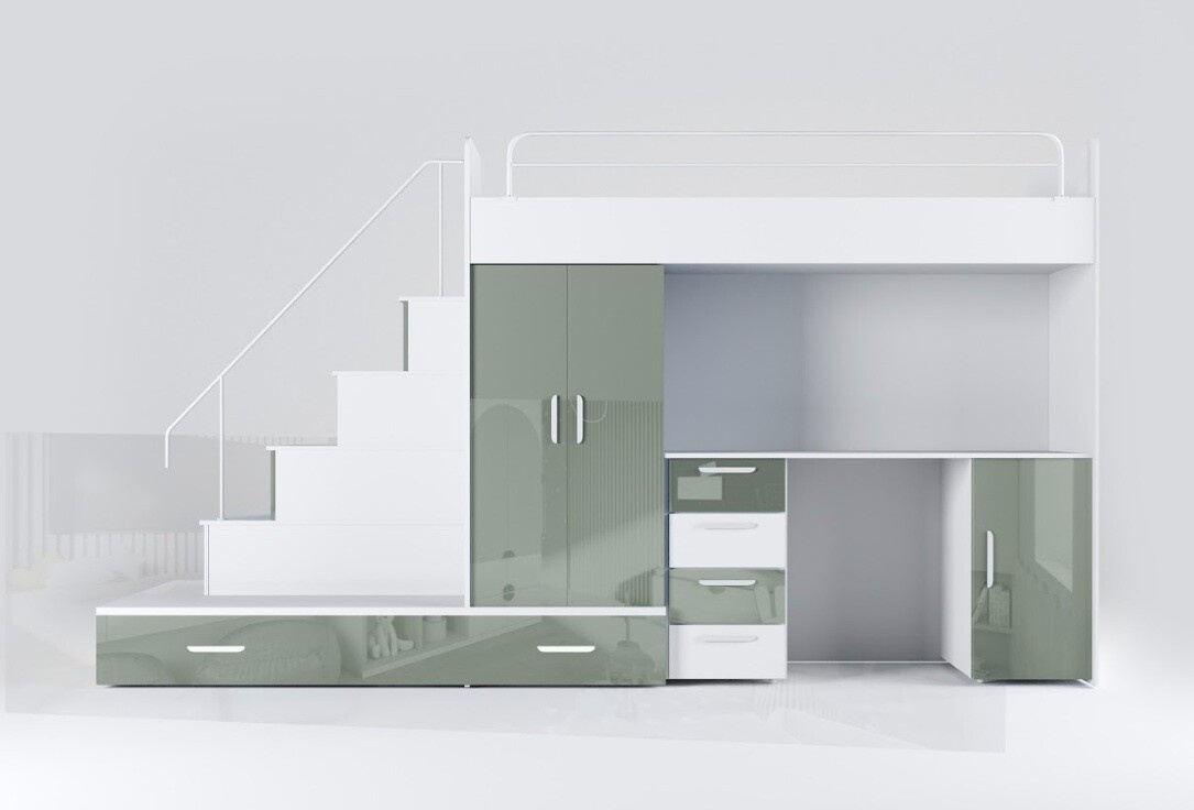 Tato postel je určená především pro osoby, které ocení moderní design, funkčnost a spoustu úložných prostorů. Patentované provedení a stabilní konstrukce postele Vám zaručuje bezpečí pro Vaše děti. Schody v sobě ukrývají spoustu úložného prostoru. Barevné provedení dvířek je v lesku a schůdky lze objednat jak na pravou tak i levou stranu (stranu schodů určujeme z čelního pohledu). Nosnost lůžka je 100 kg, nosnost schodu je 55 kg. Pod postelí se nachází psací stůl se šuplíky i šatní skříň včetně velkého výsuvného úložného šuplíku. K této posteli je možnost dokoupit další nábytek a utvořit tak krásný dětský pokoj. Uvedená úvodní fotografie je v pravém provedení.