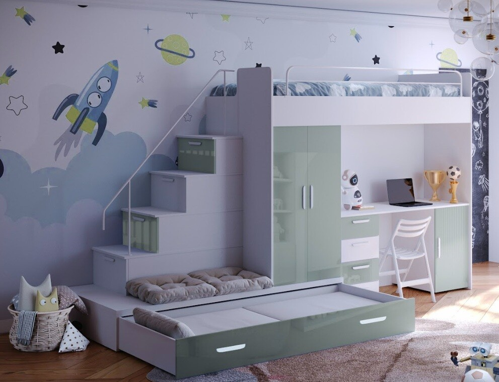 : Postel se schůdkami včetně polic, stolu a úložných prostorů