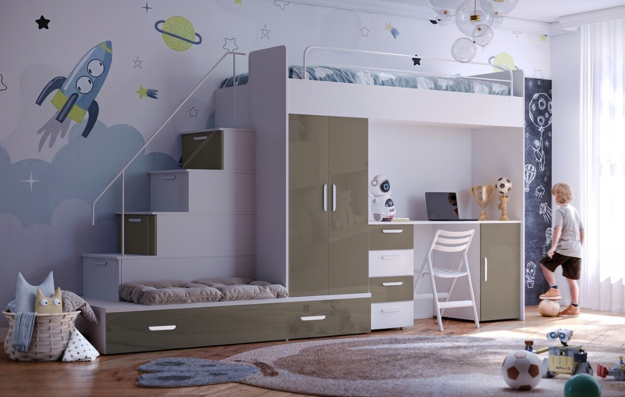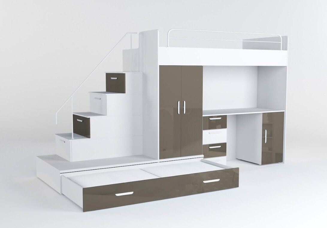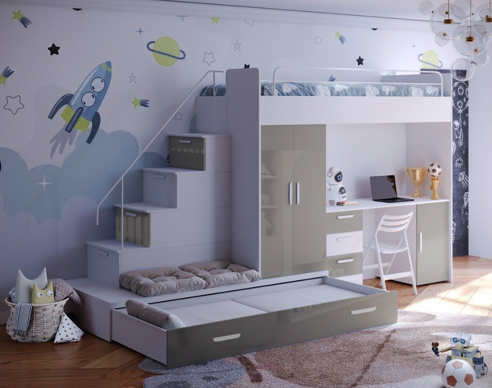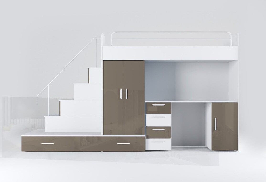Tato postel je určená především pro osoby, které ocení moderní design, funkčnost a spoustu úložných prostorů. Patentované provedení a stabilní konstrukce postele Vám zaručuje bezpečí pro Vaše děti. Schody v sobě ukrývají spoustu úložného prostoru. Barevné provedení dvířek je v lesku a schůdky lze objednat jak na pravou tak i levou stranu (stranu schodů určujeme z čelního pohledu). Nosnost lůžka je 100 kg, nosnost schodu je 55 kg. Pod postelí se nachází psací stůl se šuplíky i šatní skříň včetně velkého výsuvného úložného šuplíku. K této posteli je možnost dokoupit další nábytek a utvořit tak krásný dětský pokoj. Uvedená úvodní fotografie je v pravém provedení.