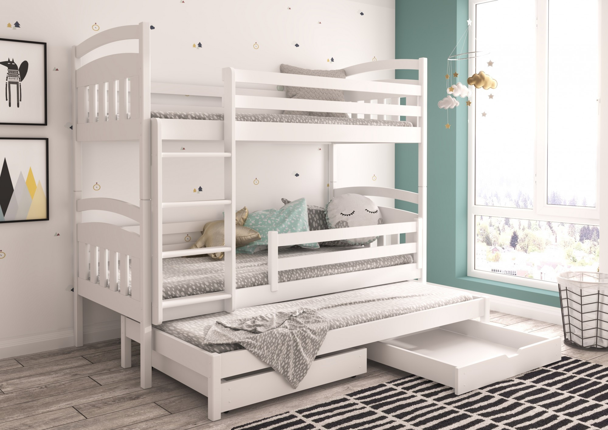 Patrová 3lůžková postel ALDO je skvělý nápad na úsporu místa v malém dětském pokoji. Nábytek má stabilní schůdkový žebřík a ochranné zábradlí umístěné téměř na každé straně rámu, díky čemuž máte jistotu, že vaše dítě je během spánku zcela v bezpečí. Navíc na spodní části postele se nacházejí dvě prostorné a funkční zásuvky na ložní prádlo. Spolu s postelí obdržíte sadu tří pěnových matrací o tloušťce 8 cm.