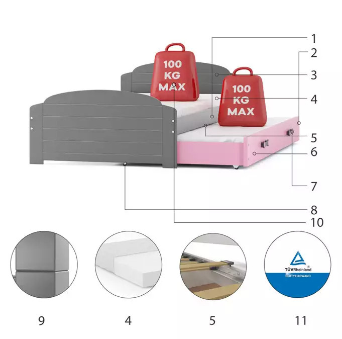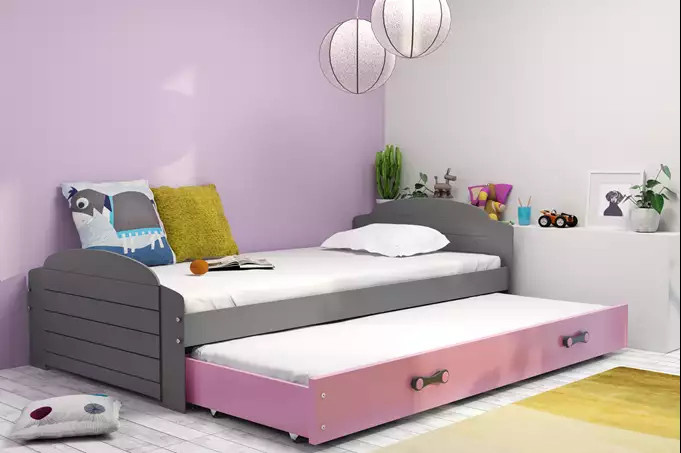 Dětská postel LILI s přistýlkou 90x200 cm, včetně matrací, Grafit/Růžová
