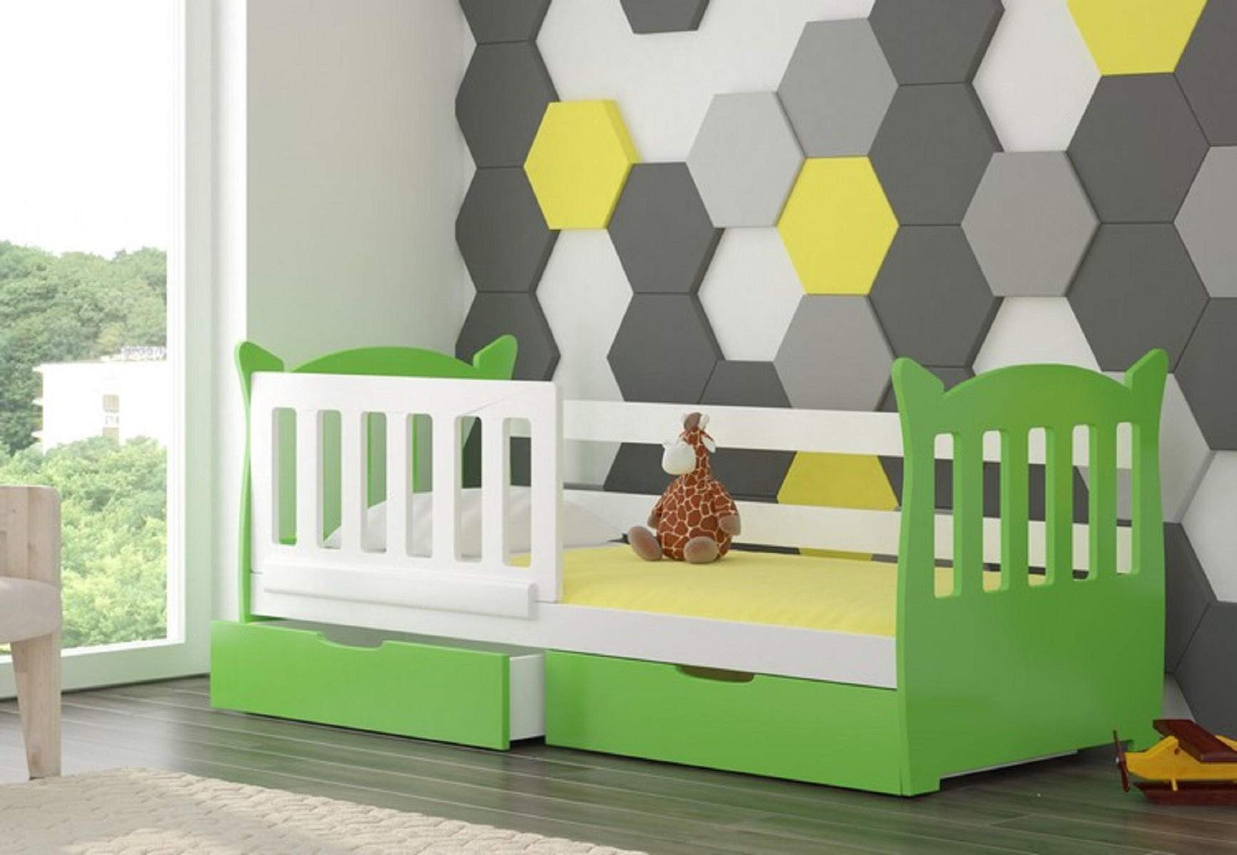 Jednolůžková postel LENA se skvěle hodí do interiéru pokoje chlapce nebo dívky. Model byl doplněn o ochrannou zábranu zajišťující bezpečnost během spánku a prostorné a funkční zásuvky na ložní prádlo. Součástí sady je také odolný rám a pěnová matrace s bavlněným potahem na zip.