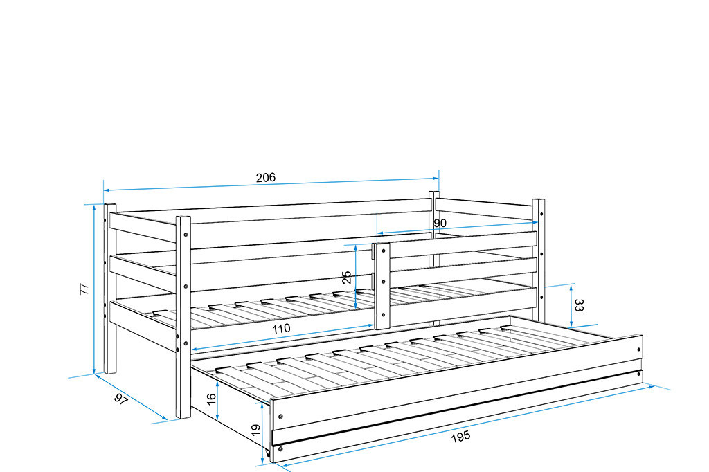 Dětská postel Norbert II je určena pro ty, kteří pro své dítě hledají funkčnost, pohodlí a kvalitu. Postel je vyrobena z borovicového dřeva. Její stabilní konstrukce, zaoblené hrany a zábrana, která je v ceně postele, zajišťují bezpečnost a pohodlí dítěte. Zábranu si můžete podle potřeby umístit na pravou, nebo levou stranu postele. Součástí postele je také praktická přistýlka s matrací, kterou můžete využít pro druhé dítě, nebo když u Vašeho dítěte bude chtít přespat kamarád/ka. Obě části postele mají rošt a pěnovou matraci se snímatelným potahem. Tloušťka matrace je 7cm. Plocha pro spaní je 90x200 cm (vrchní část) a 80x190 cm (přistýlka). Postel je dodávána v demontu a součástí je montážní plánek včetně všech potřebných spojovacích materiálů. Vyobrazené dekorace nejsou v ceně. Zobrazení barev na fotografii se může od skutečnosti nepatrně lišit.