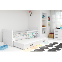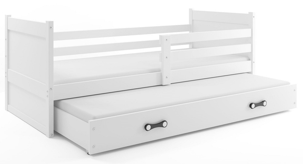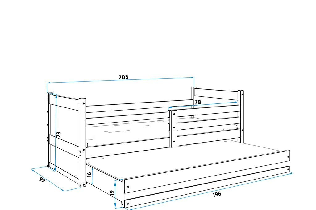 Dětská postel Riky II je určena pro ty, kteří pro své dítě hledají funkčnost, moderní design a kvalitu. Postel je vyrobena z borovicového dřeva v kombinaci s MDF deskou (barevné panely na bocích postele). Její stabilní konstrukce, zaoblené hrany a zábrana, která je v ceně postele, zajišťují bezpečnost a pohodlí dítěte. Zábranu si můžete podle potřeby umístit na pravou, nebo levou stranu postele. Součástí postele je také praktická přistýlka s matrací, kterou můžete využít pro druhé dítě, nebo když u Vašeho dítěte bude chtít přespat kamarád/ka. Obě části postele mají rošt a pěnovou matraci se snímatelným potahem. Tloušťka matrace je 7cm. Plocha pro spaní je 90x200 cm (vrchní část) a 80x190 cm (přistýlka). Postel je dodávána v demontu a součástí je montážní plánek včetně všech potřebných spojovacích materiálů. Vyobrazené dekorace nejsou v ceně. Zobrazení barev na fotografii se může od skutečnosti nepatrně lišit.