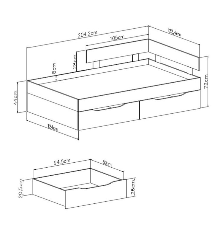 Postel je dodávána včetně zábran a šuplíků pod postelí. Součástí postele je rošt.