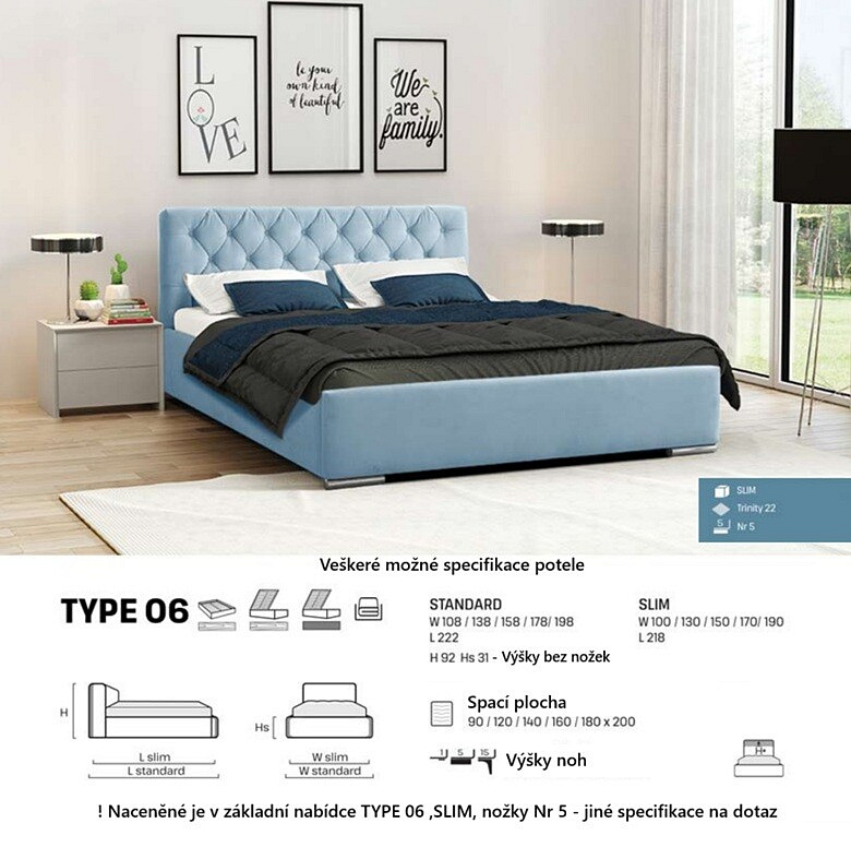 Postel TYP 06 je potažena vysoce kvalitní potahovou látkou, která dodává interiéru nádech luxusu a elegance. Její jemná textura a odolnost zajišťují dlouhou životnost a snadnou údržbu. S rozměry spací plochy viz parametry produktu je ideální volbou pro jednotlivce, kteří si přejí prostorné a pohodlné lůžko.