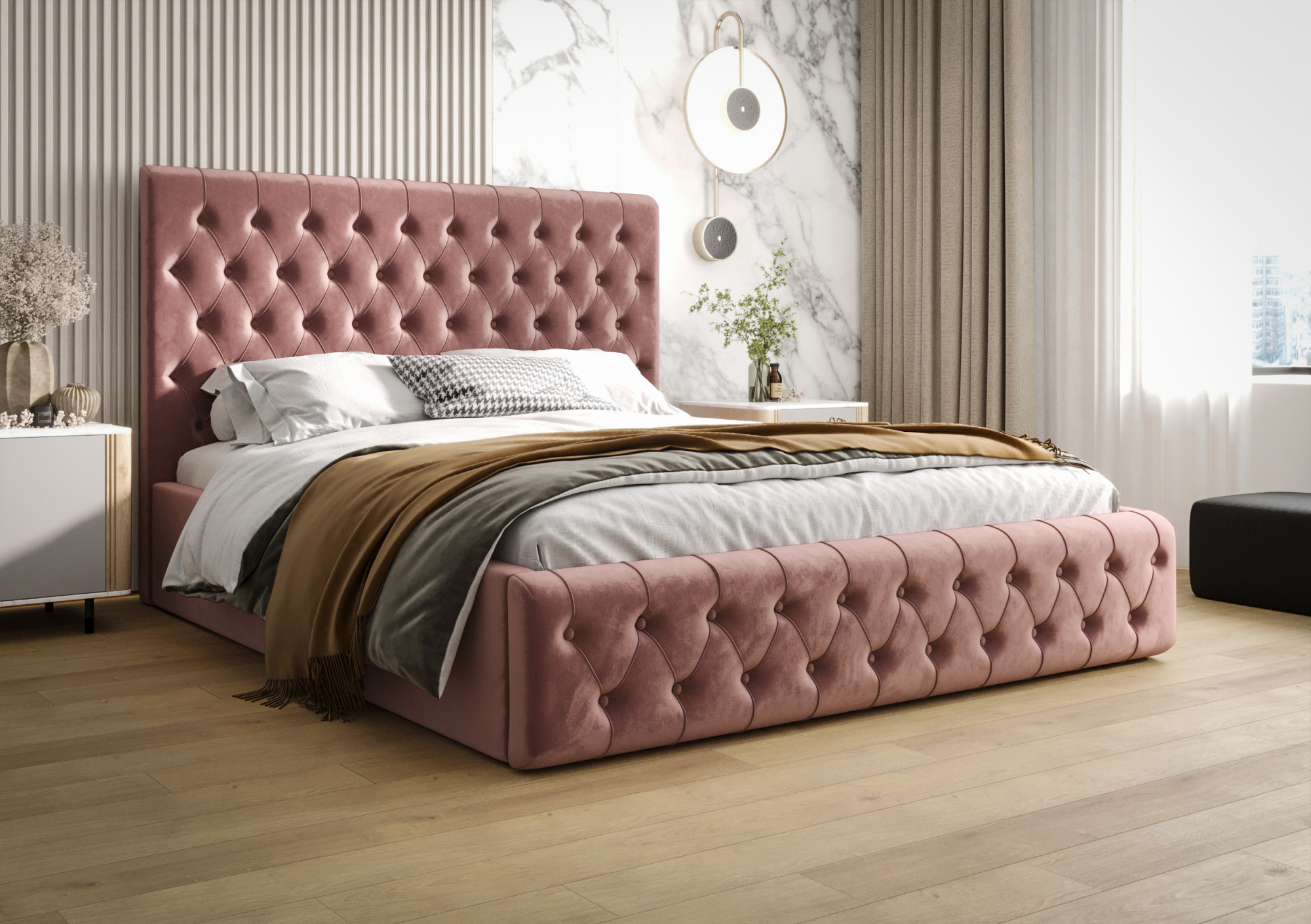 Čalouněná postel Valentino je ideálním modelem pro fanoušky stylu glamour. Celek doplňuje ozdobné prošívané čelo a úložný prostor na ložní prádlo.