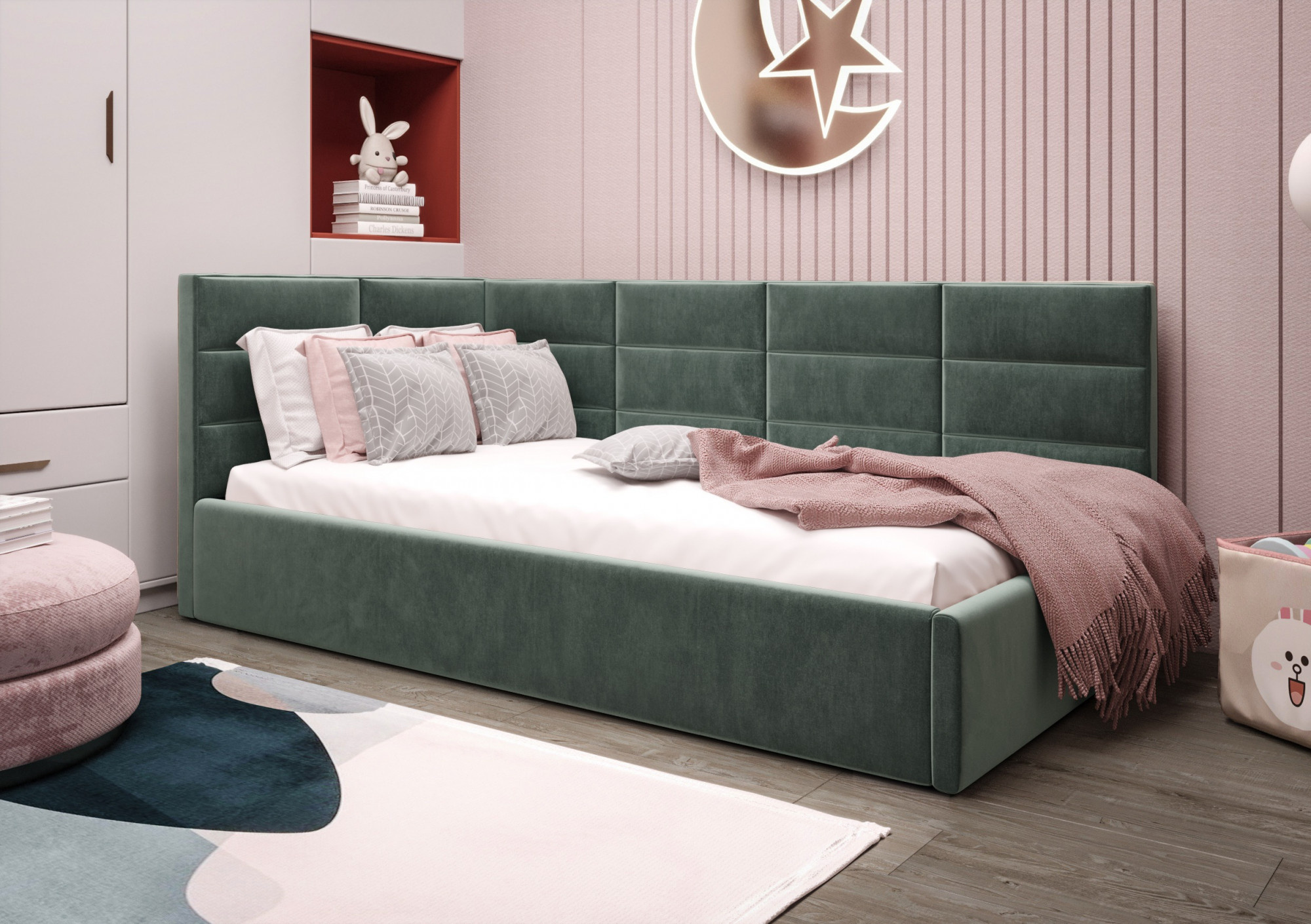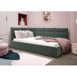 Čalouněná postel ZAZU je naším návrhem modelu pro jednu osobu. Vytvořen s ohledem na nejmladší – skvěle se uplatní také v pokoji pro mládež, hotelovém nebo penzionovém pokoji. Široký výběr tkanin a barev umožní přizpůsobit nábytek interiéru, který zařizujete. Již dnes se postarejte o spánek svého dítěte s značkou Meble Górecki.