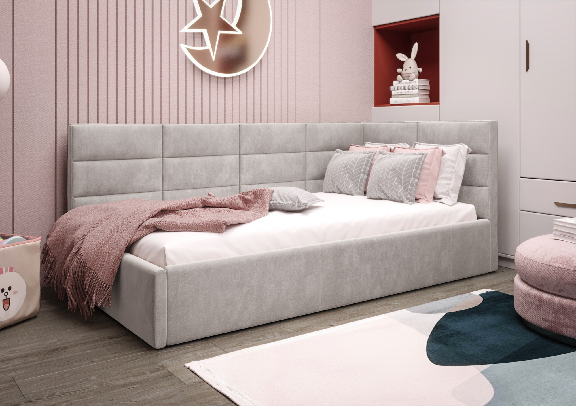 Čalouněná postel ZAZU je naším návrhem modelu pro jednu osobu. Vytvořen s ohledem na nejmladší – skvěle se uplatní také v pokoji pro mládež, hotelovém nebo penzionovém pokoji. Široký výběr tkanin a barev umožní přizpůsobit nábytek interiéru, který zařizujete. Již dnes se postarejte o spánek svého dítěte s značkou Meble Górecki.