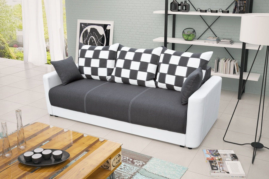 Moderní rozkládací pohovka s úložným prostorem. Výplň pohovky tvoří pružiny bonell a faliste v kombinaci s kvalitní PUR pěnou. Jednoduchým rozkladem pomocí automatu vznikne lůžko vhodné k příležitostnému spaní. Pohovku dodáváme v několika barevných provedeních, které také naleznete v naší nabídce. Rozpis rozměrů najdete na přiloženém obrázku s nákresem. V ceně pohovky jsou 3 velké kostkované polštáře a 2 malé polštáře v barvě pohovky. Ostatní vyobrazené dekorace nejsou v ceně.