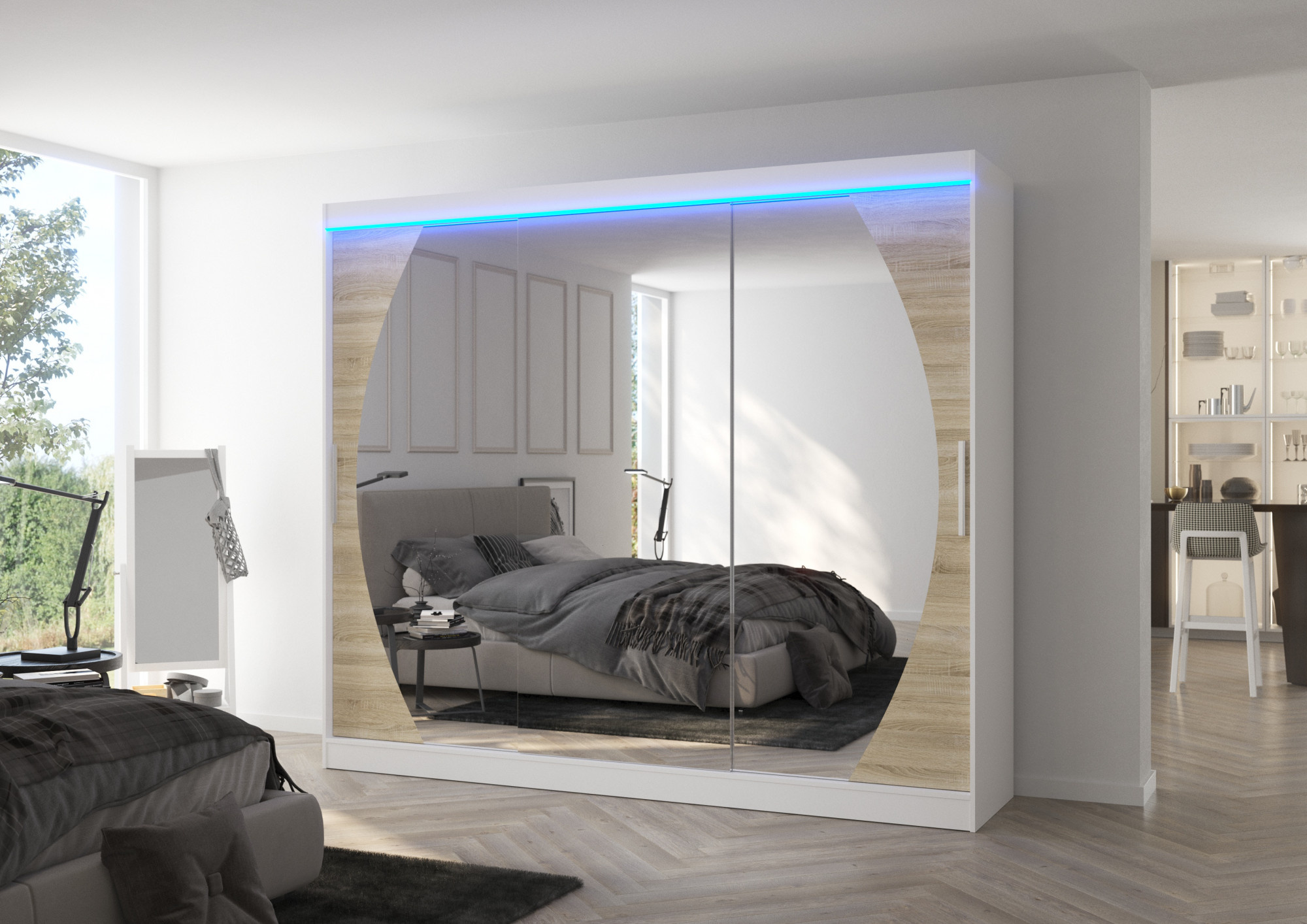 Posuvná skříň se zrcadlem a LED osvětlením CAMBE 250 Bílá+Sonoma