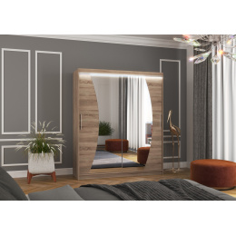 Šatní skříň s posuvnými dveřmi a zrcadlem DOLORES je ideálním způsobem, jak uspořádat prostor. Nábytek je vybaven prostornými policemi a tyčí, na kterou můžete pověsit šaty, obleky, svrchní oděvy nebo košile. Na čelní stranu byla připevněna zrcadla, která opticky zvětšují prostor. Díky tomu, že skříň je posuvná, nemusíte vyčleňovat další místo na otevření dveří, což z ní činí ideální řešení pro malý pokoj nebo úzkou předsíň. Zajímavým prvkem je efektní LED osvětlení, které dodává skříni i místnosti nádherný půvab.
