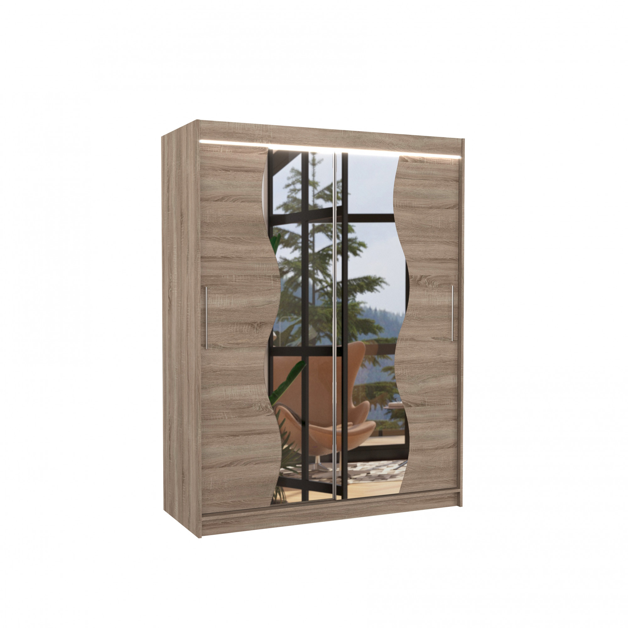 Šatní skříň s posuvnými dveřmi a zrcadlem RENZO je ideálním způsobem, jak uspořádat prostor. Nábytek je vybaven prostornými policemi a tyčí, na kterou můžete pověsit šaty, obleky, svrchní oděvy nebo košile. Na čelní straně bylo připevněno zrcadlo, které opticky zvětšuje prostor. Díky tomu, že skříň je posuvná, nemusíte vyčleňovat další místo na otevření dveří, což z ní činí ideální řešení pro malý pokoj nebo úzkou předsíň. Zajímavým prvkem je efektní LED osvětlení, které dodává skříni i místnosti nádherný půvab.