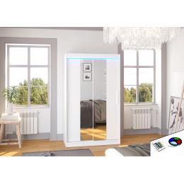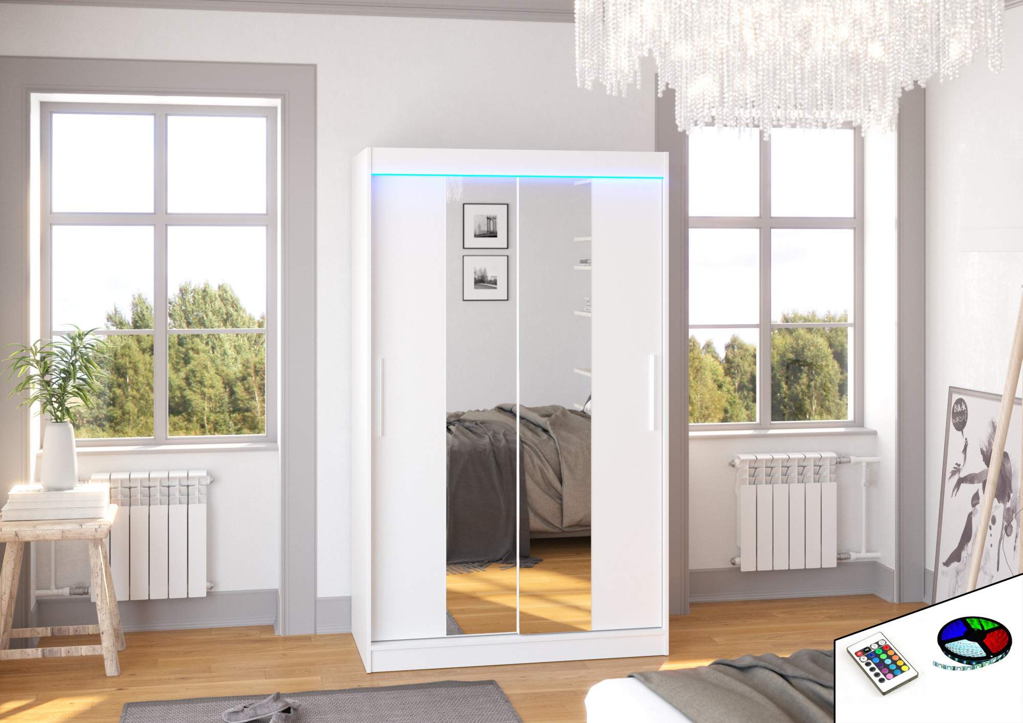 Šatní skříň s posuvnými dveřmi, zrcadlem a LED osvětlením SANTOS 120 Bílá+Bílá