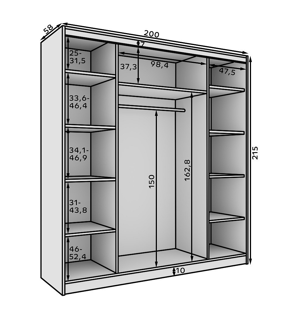 Šatní skříň s posuvnými dveřmi Greta 200 je moderní a funkční řešení, které se skvěle hodí do každé ložnice, šatny nebo předsíně. Její minimalistická forma, geometrické rozdělení čel a pečlivé zpracování dodávají interiéru elegantní a nadčasový charakter. Nábytek je vyroben z vysoce kvalitní laminované desky o tloušťce 16 mm, odolné proti poškrábání, vlhkosti a UV záření, což zaručuje trvanlivost a estetiku po dlouhá léta používání. Skříň je vybavena systémem posuvných dveří, který zajišťuje pohodlné otevírání a zavírání, a zároveň šetří prostor – ideální řešení pro menší místnosti. Vnitřek skříně byl navržen s ohledem na maximální funkčnost – nachází se v ní sada polic a tyčí, díky nimž snadno uspořádáte oblečení, doplňky a další předměty denní potřeby. Model Greta 200 je k dispozici v pěti barevných variantách: klasické bílé, elegantní černé, moderní kombinaci bílá + černá, černá + bílá a v módním odstínu kašmíru.