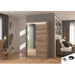 Šatní skříň s posuvnými dveřmi a zrcadlem BARIO je ideálním způsobem, jak uspořádat prostor. Nábytek je vybaven prostornými policemi a tyčí, na kterou můžete pověsit šaty, obleky, svrchní oděvy nebo košile. Na čelní straně bylo připevněno zrcadlo, které opticky zvětšuje prostor. Díky tomu, že skříň je posuvná, nemusíte vyčleňovat další místo na otevření dveří, což z ní činí ideální řešení pro malý pokoj nebo úzkou předsíň. Zajímavým prvkem je efektní LED osvětlení, které dodává skříni i místnosti nádherný půvab.