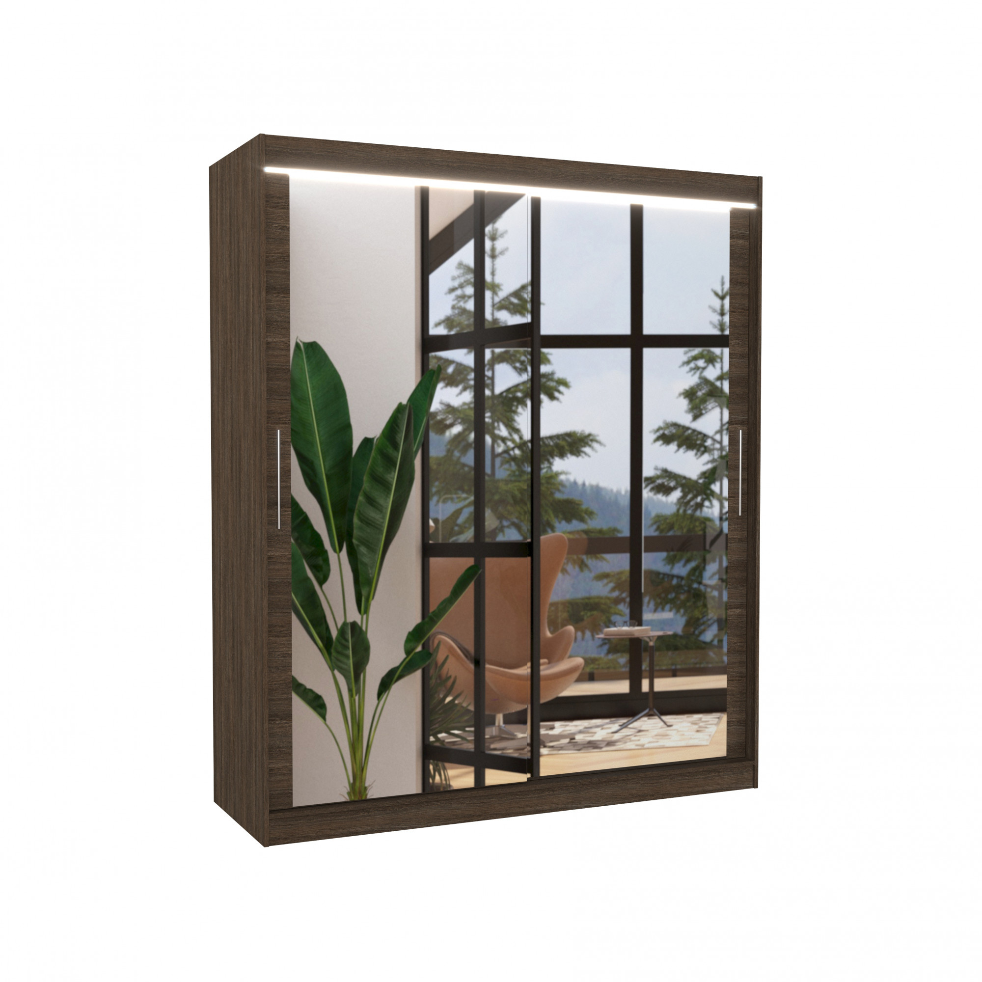 Šatní skříň s posuvnými dveřmi, zrcadlem a LED osvětlením ETTORE 180 Choco+Choco