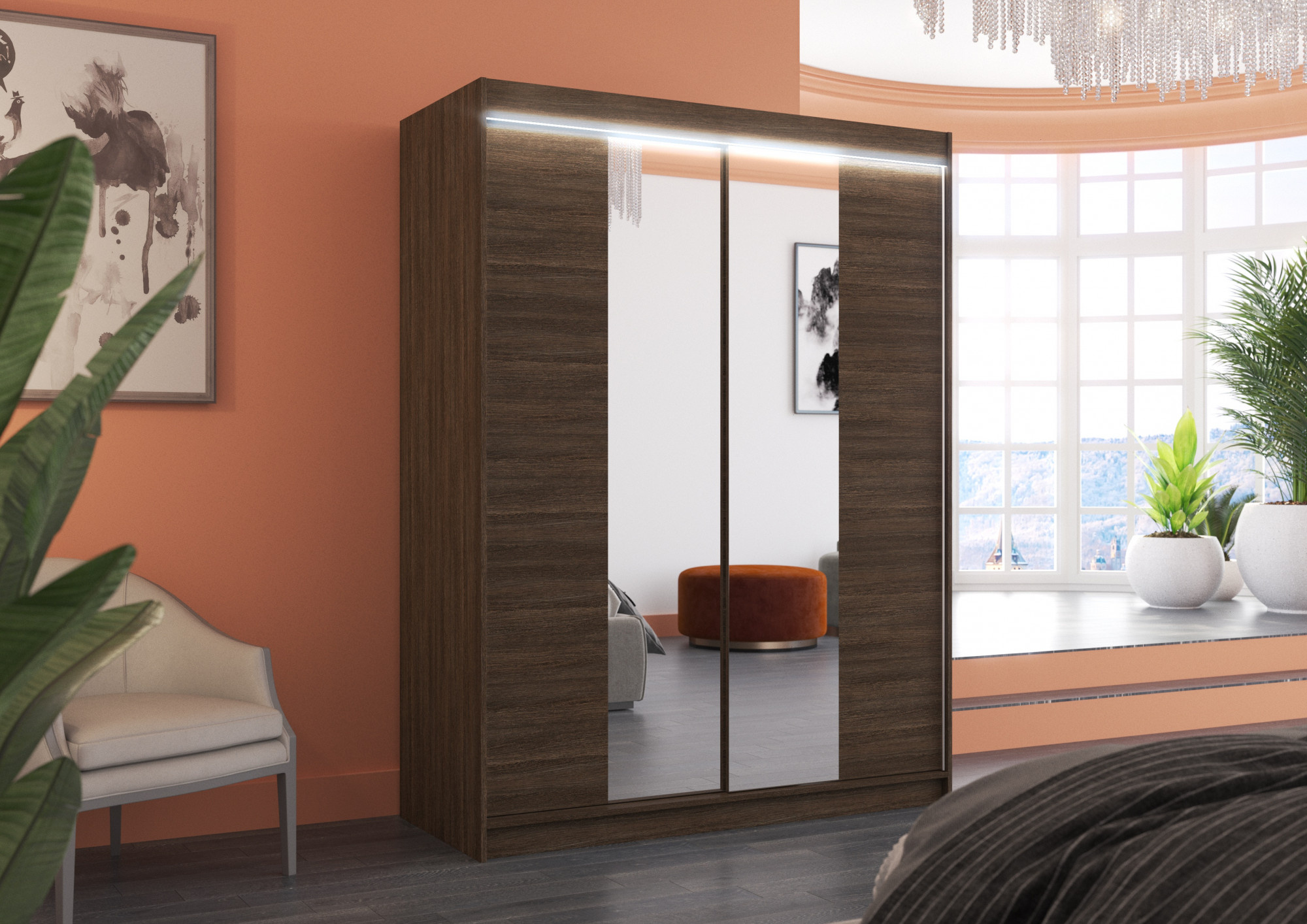 Šatní skříň s posuvnými dveřmi, zrcadlem a LED osvětlením FEVER 150 Choco+Choco