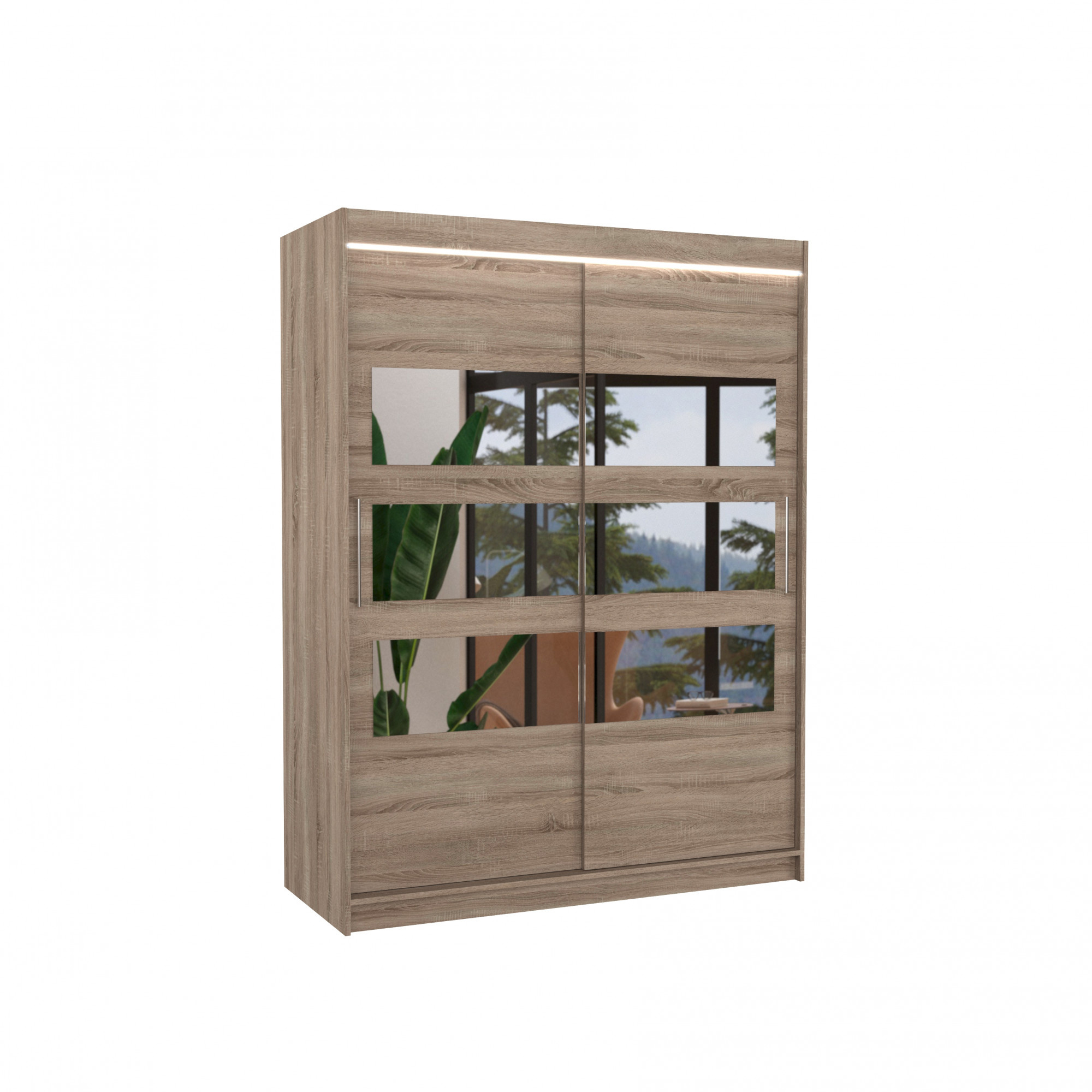 Šatní skříň s posuvnými dveřmi a zrcadlem FLORENTO je ideálním způsobem, jak uspořádat prostor. Nábytek je vybaven prostornými policemi a tyčí, na kterou můžete pověsit šaty, obleky, svrchní oděvy nebo košile. Na čelní straně byla připevněna horizontální zrcadla, která opticky zvětšují prostor a zároveň dodávají jedinečný styl. Díky tomu, že skříň je posuvná, nemusíte vyčleňovat další místo na otevření dveří, což z ní činí ideální řešení pro malý pokoj nebo úzkou předsíň. Zajímavým prvkem je efektní LED osvětlení, které dodává skříni i místnosti nádherný půvab.